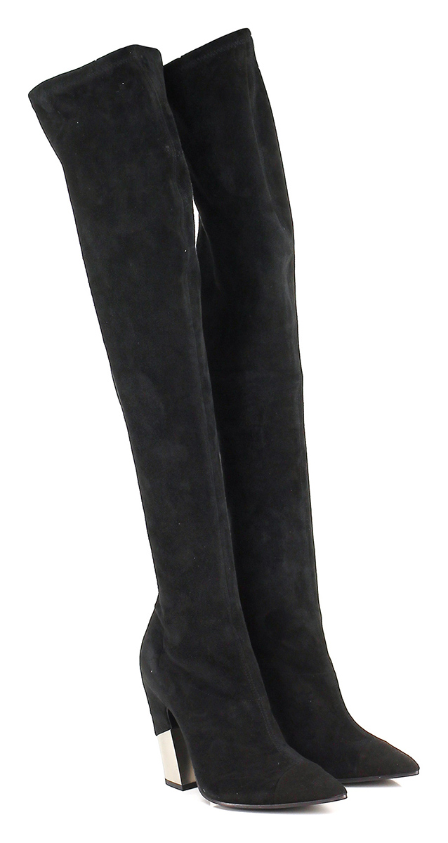 Stivale in camoscio e gambale stretch con suola in gomma. Tacco 120, altezza gambale 530.