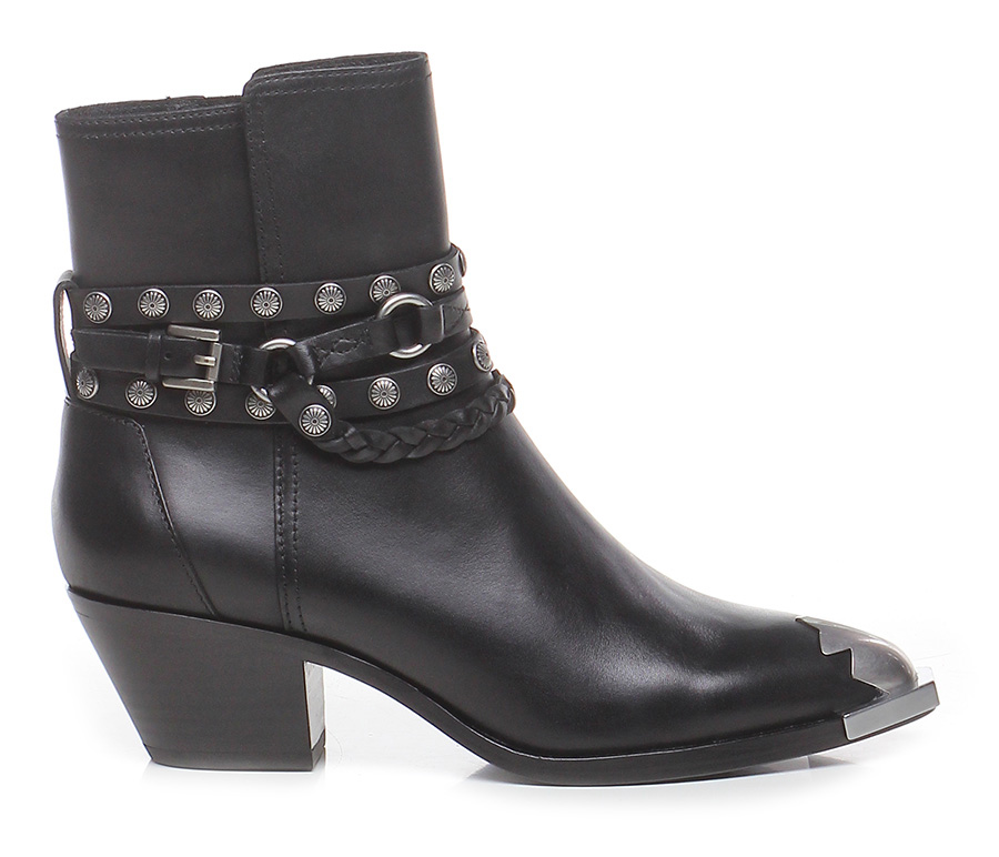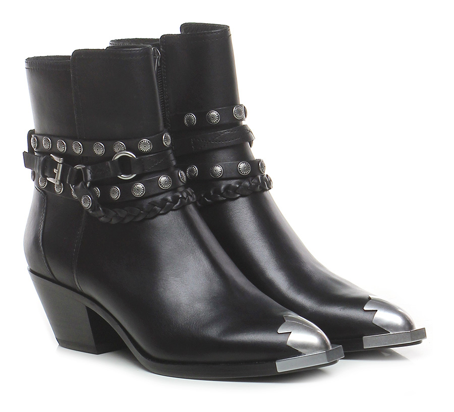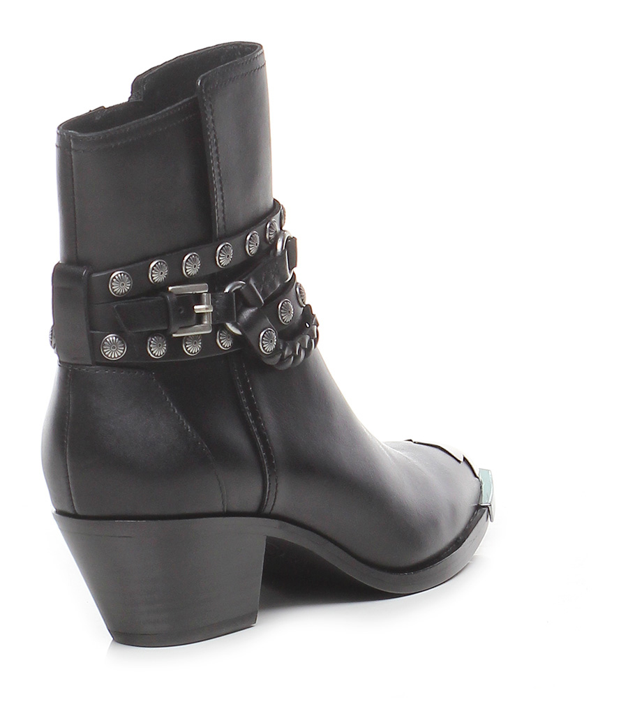 Tronchetto in pelle con zip lato interno e inserto metallico con multi cinturini con borchie alla caviglia, suola in cuoio. Tacco 50.