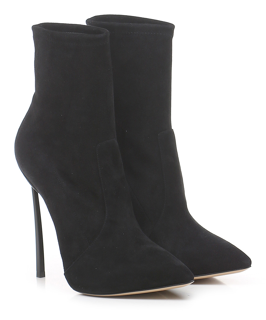 Tronchetto in camoscio e camoscio stretch con suola in cuoio. Altezza tacco 125mm. Tacco blade.