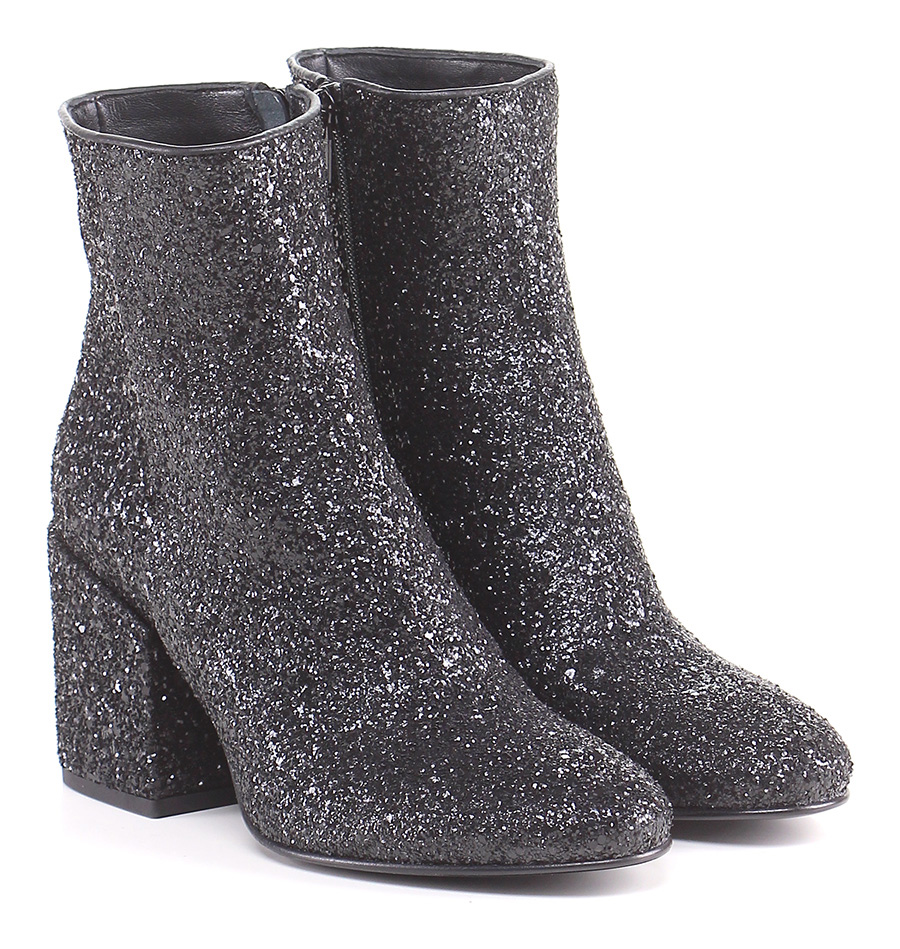Tronchetto in glitter con zip su lato interno e suola in cuoio. Tacco 80.