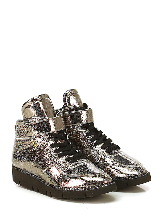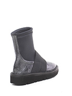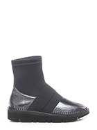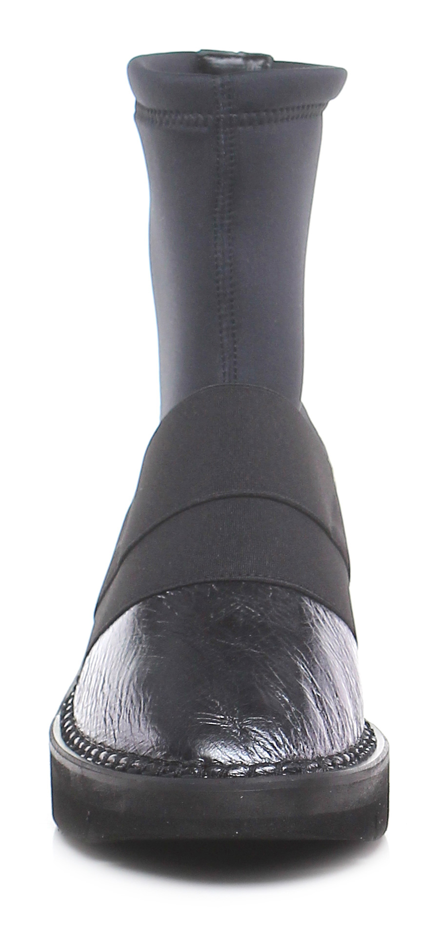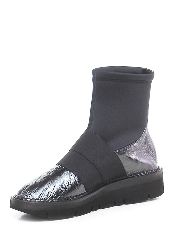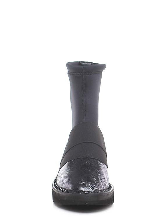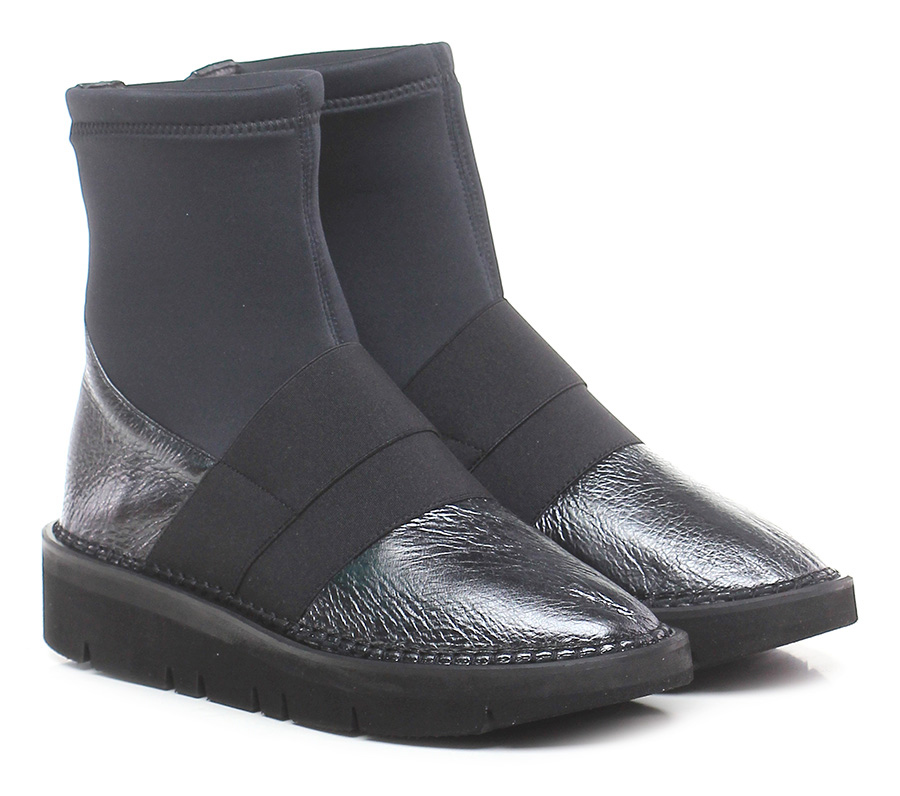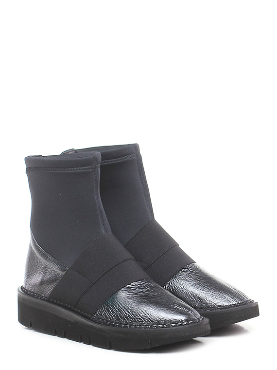 Tronchetto in pelle laminata e tessuto con doppia fascia elasticizzata frontale e tomaia in neoprene, suola in gomma light. Tacco 40, platform 25 con battuta 15.