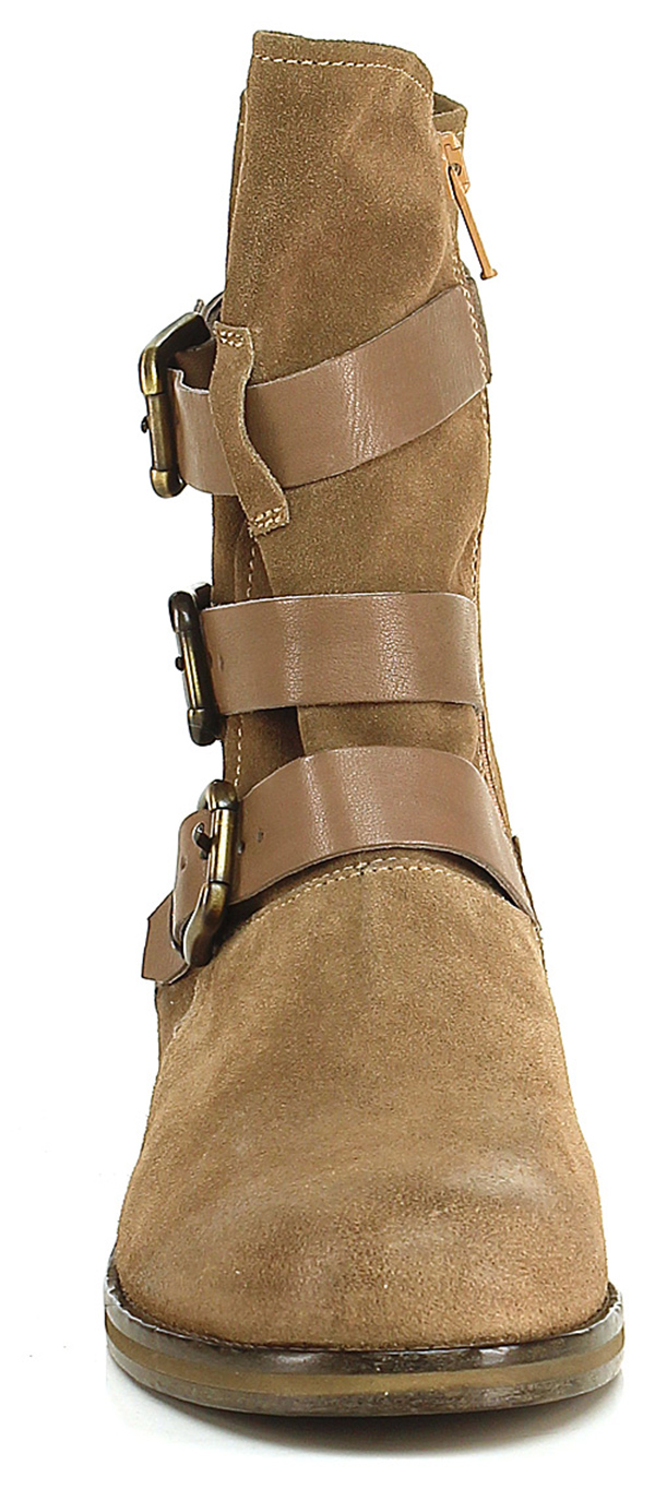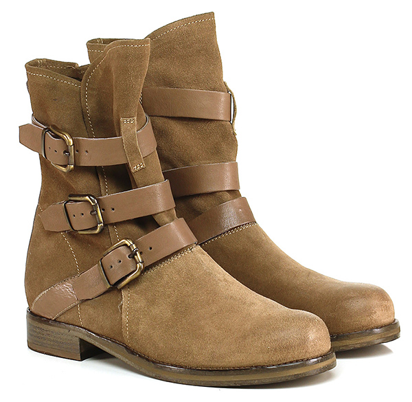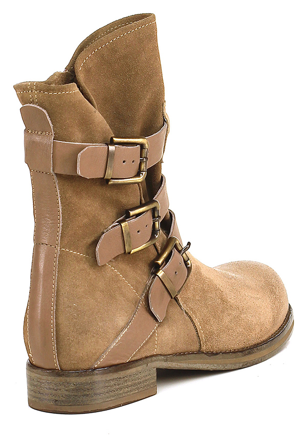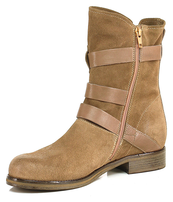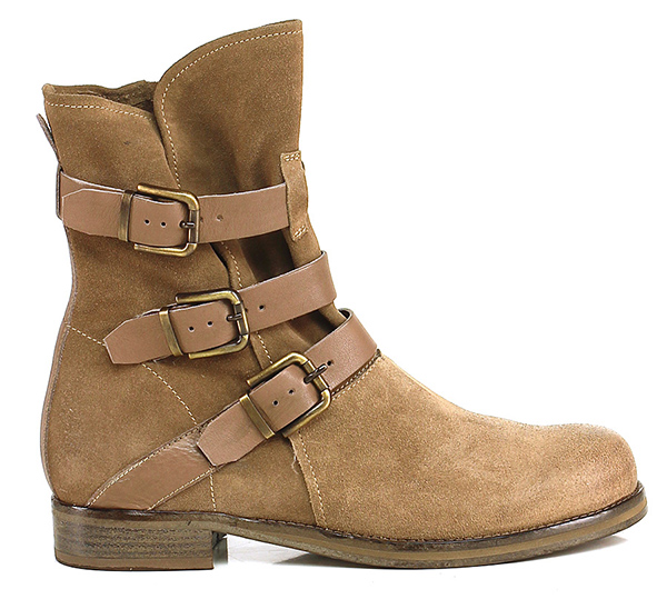 Tronchetto in camoscio e pelle con zip su lato interno e multi cinturini. Interno sfoderato, suola in cuoio. Tacco 30.