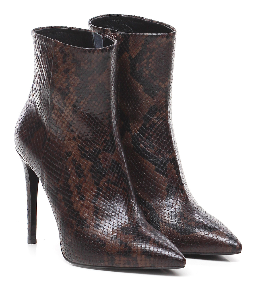 Tronchetto in pelle stampa effetto pitone con zip lato interno, suola in cuoio e gomma. Tacco 110, rivestito in pelle effetto pitone.