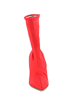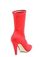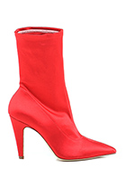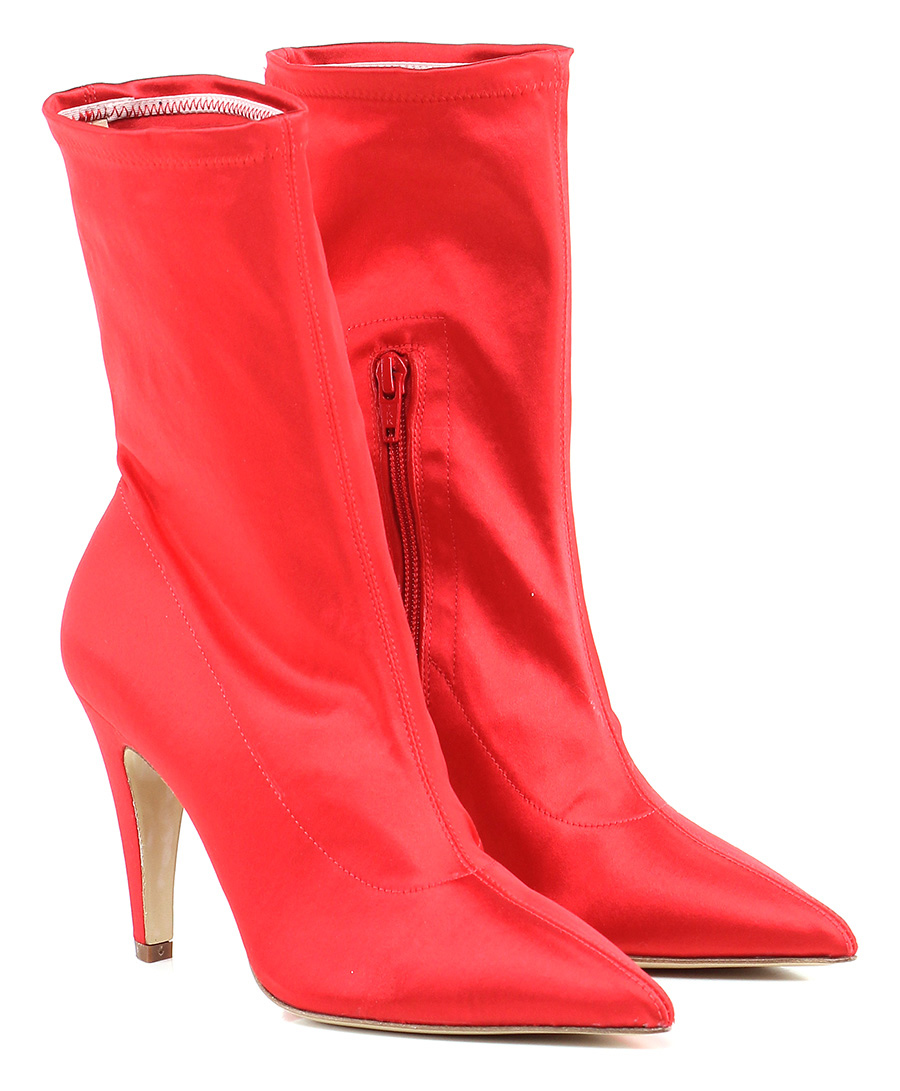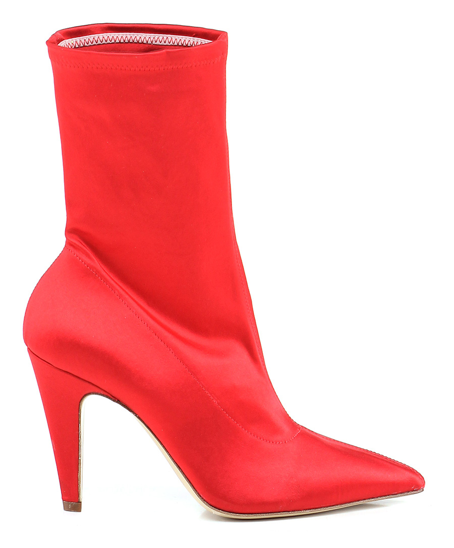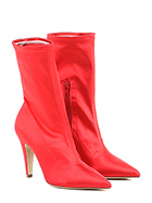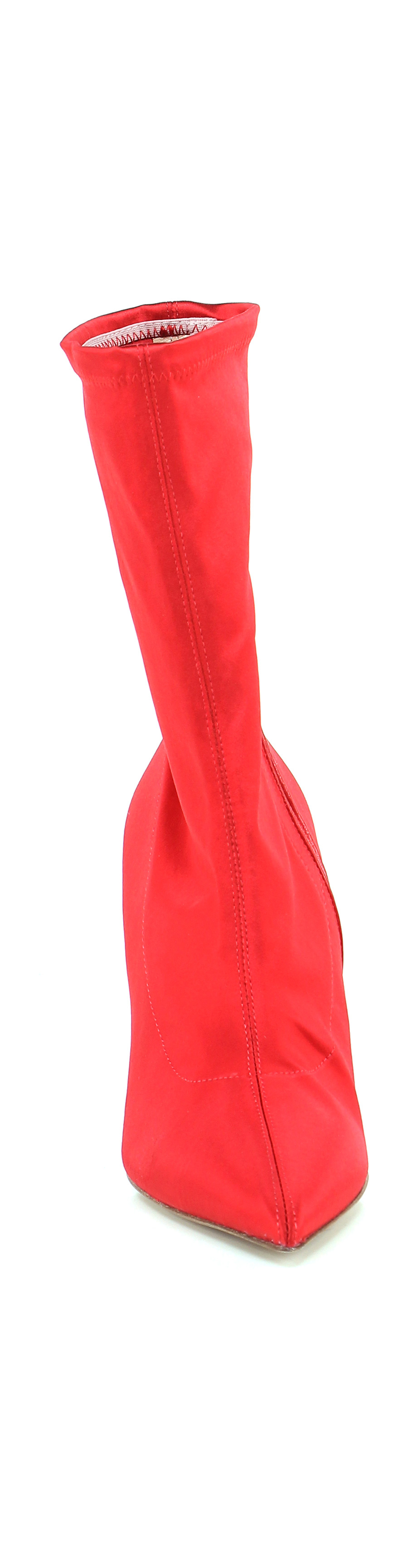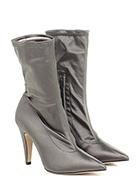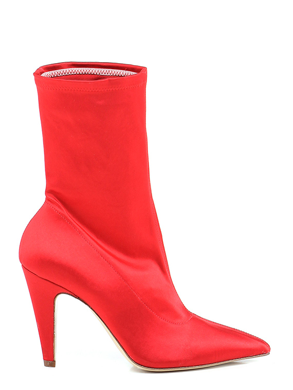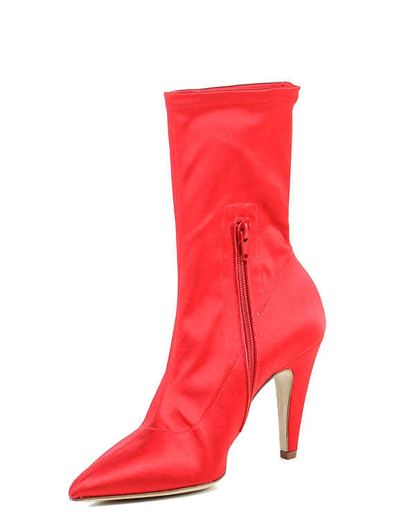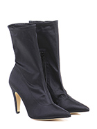 Tronchetto in tessuto raso con zip su lato interno e gambale stretch. Suola in cuoio, tacco 100.