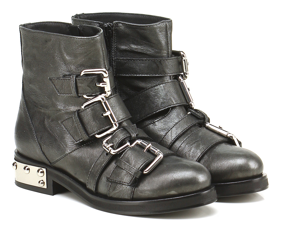Tronchetto in pelle laminata con effetto vintage, zip su lato interno e multi cinturino frontale. Suola in cuoio, tacco 40, platform 15 con battuta 25.