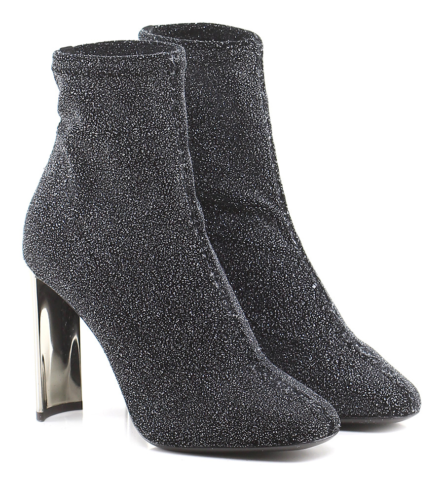 Tronchetto in tessuto lavorato con suola in cuoio, tacco 100 effetto metallico.