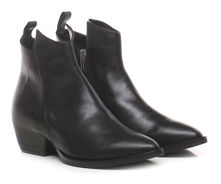 Tronchetto in pelle con zip lato interno, suola in gomma. Tacco 40.