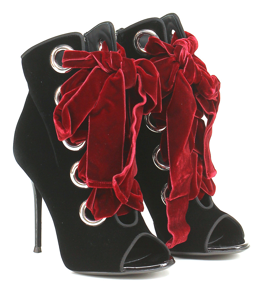 Tronchetto open toe in velvet con zip su lato interno e suola in cuoio. Tacco 110.