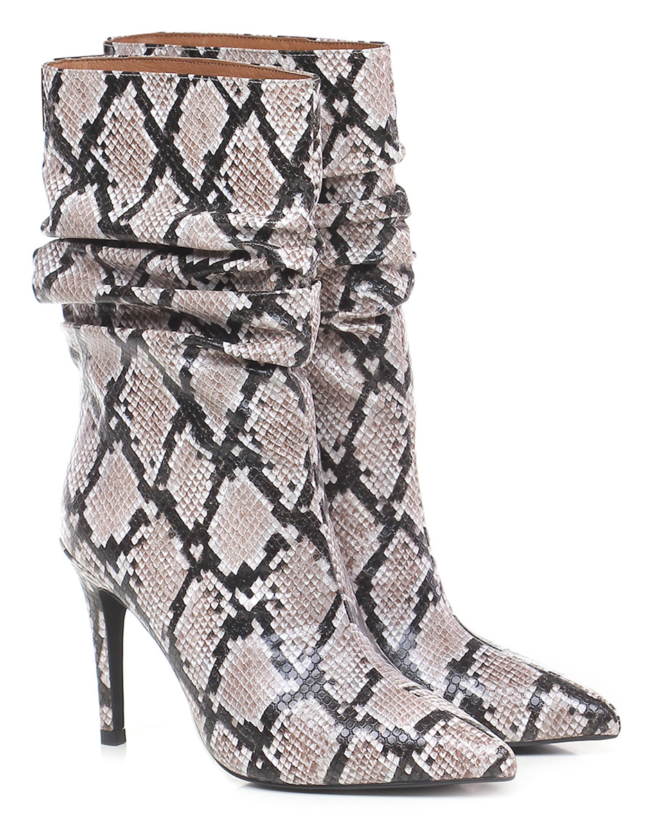Tronchetto in eco pelle stampa pitone, suola in gomma. Tacco 100 rivestito in eco pelle stampa pitone.