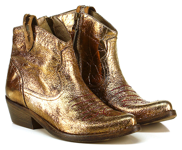Tronchetto in pelle laminata effetto stroppicciato con zip su lato interno e suola in cuoio. Tacco 50, platform 15 con battuta 35.