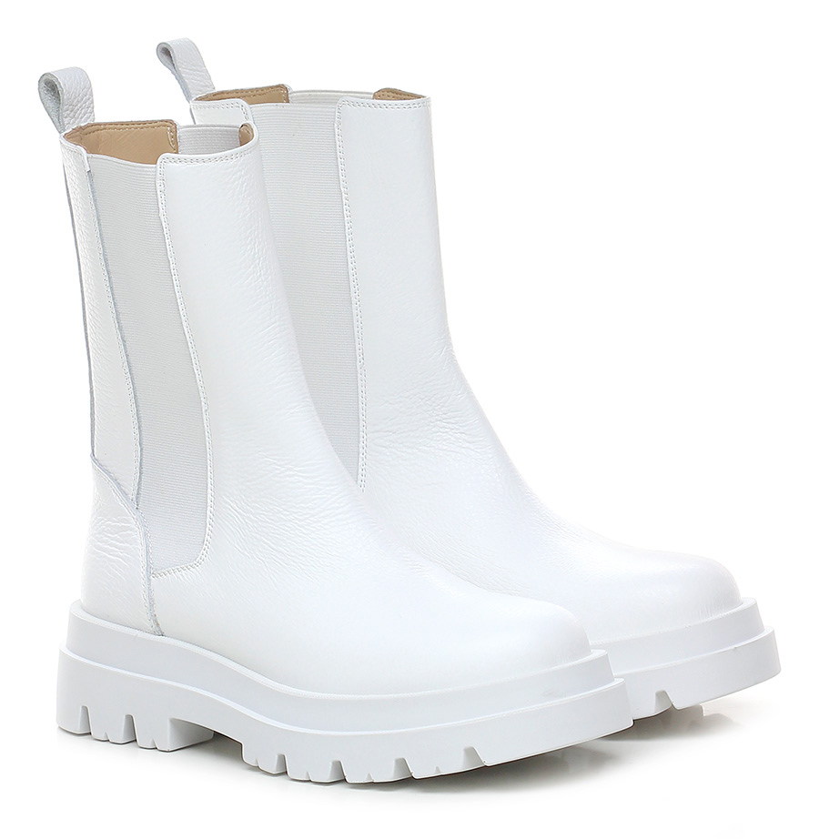 Tronchetto chunky in pelle martellata con inserti elasticizzati ambo i lati, suola in gomma. Tacco 55, platform 35 con battuta 20, punta tonda.