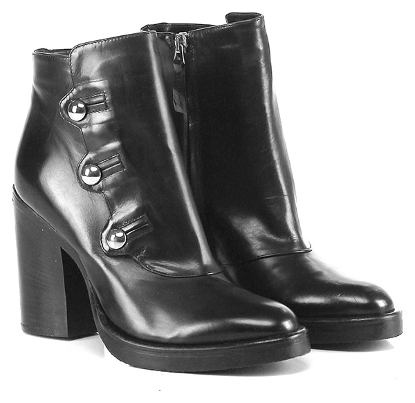 Tronchetto in pelle con zip su lato interno e chiusura con bottoni su lato esterno. Suola in gomma, tacco 100, platform 15 con battuta 85.