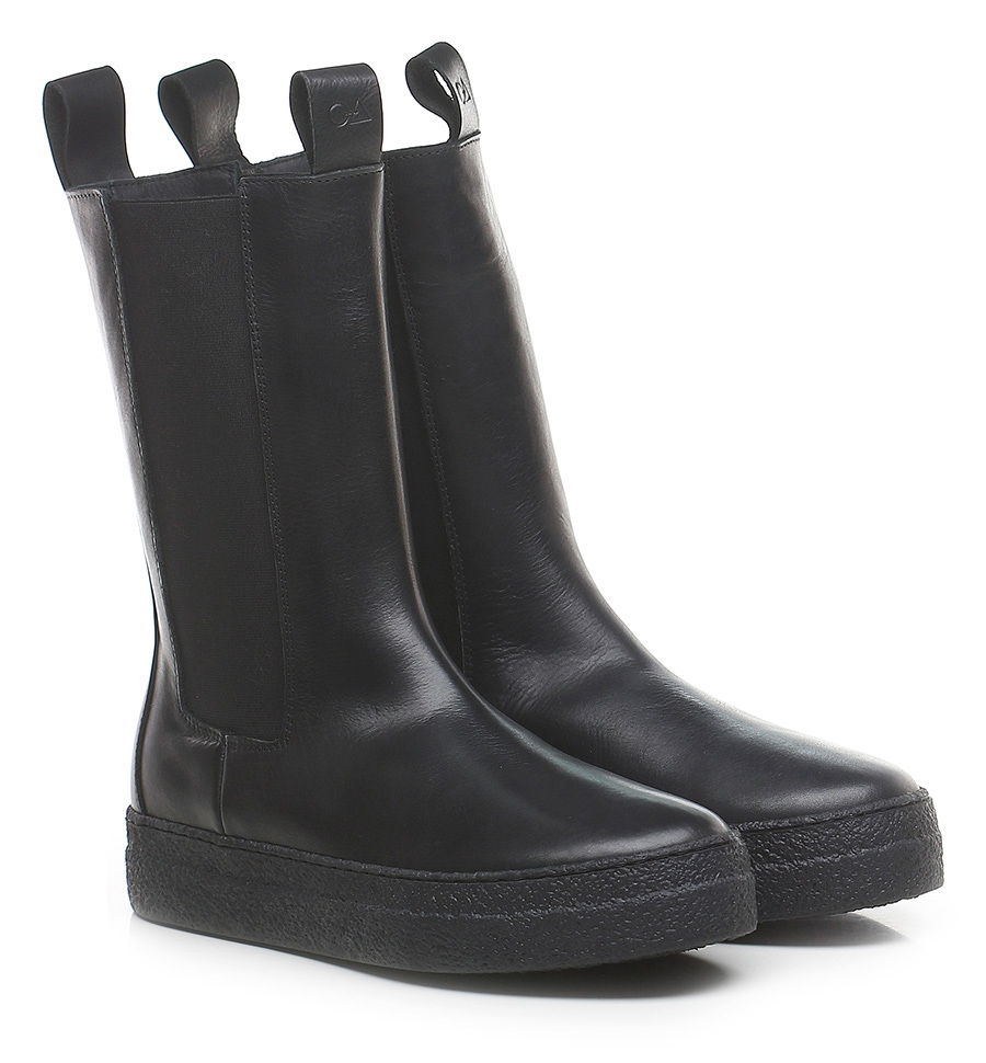 Tronchetto in pelle con inserti elasticizzati laterali e suola in gomma. Altezza tacco 35mm, platform 30mm con battuta 5mm.