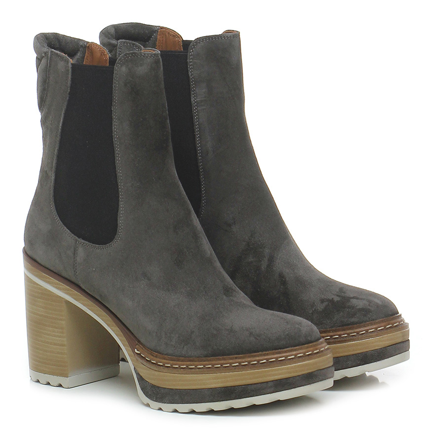 Tronchetto in camoscio con inserti elasticizzati ambo lati, suola in gomma. Tacco 95, platform 35 con battuta 60.