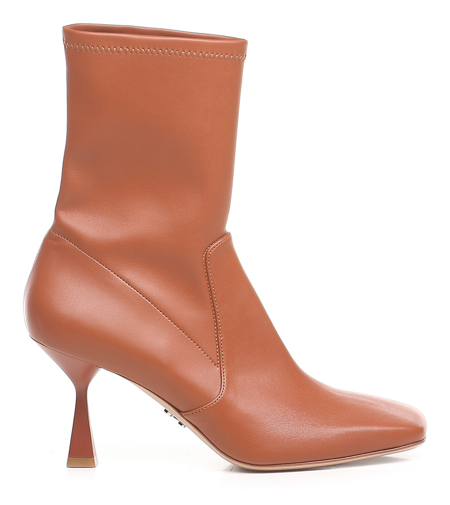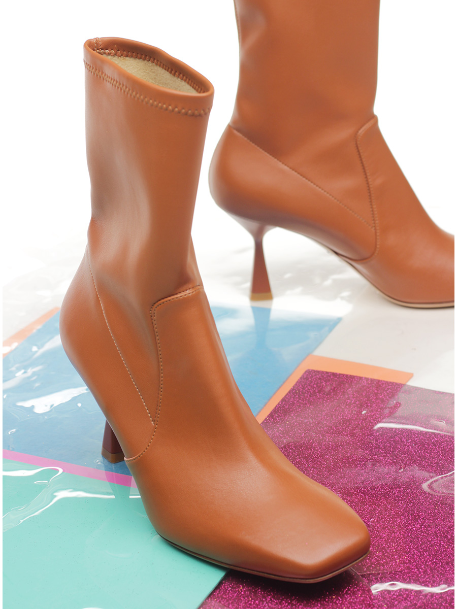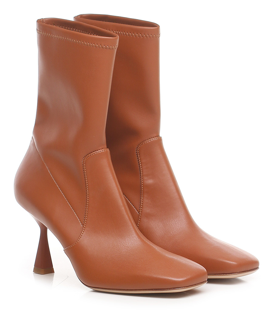 Tronchetto in similpelle e similpelle stretch con suola in cuoio. Altezza tacco 75mm. Tacco a rocchetto in pvc opaco.