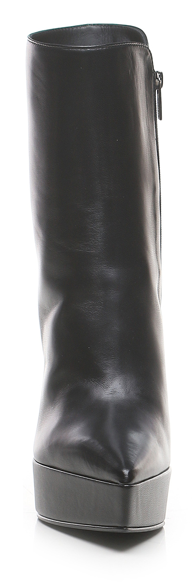 Tronchetto in pelle con zip laterale e suola in cuoio e gomma. Platform foderato in pelle. Altezza tacco 135mm, platform 35mm con battuta 100mm.