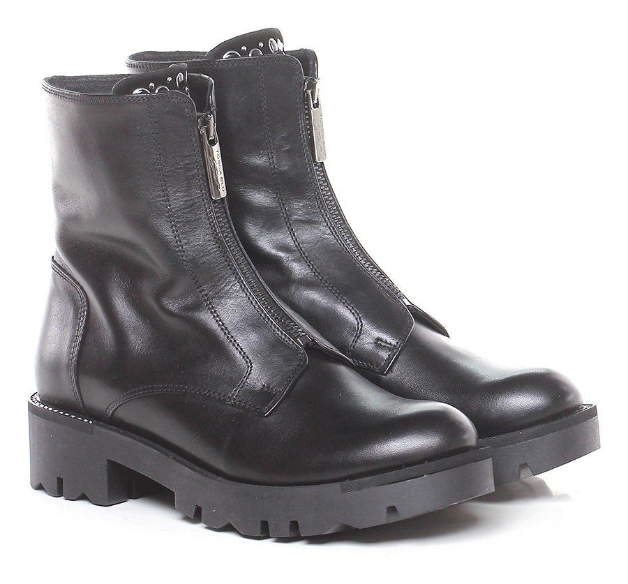 Tronchetto in pelle vintage con zip frontale e borchie su linguetta. Suola in gomma, tacco 40.
