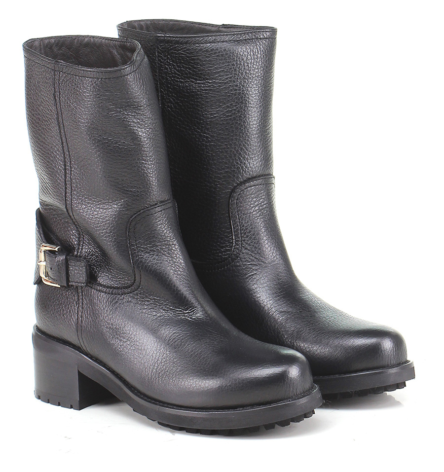 Tronchetto in pelle effetto martellato con cinturino su retro con fibbia silver e suola in gomma. Tacco 50, platform 20 con battuta 30.