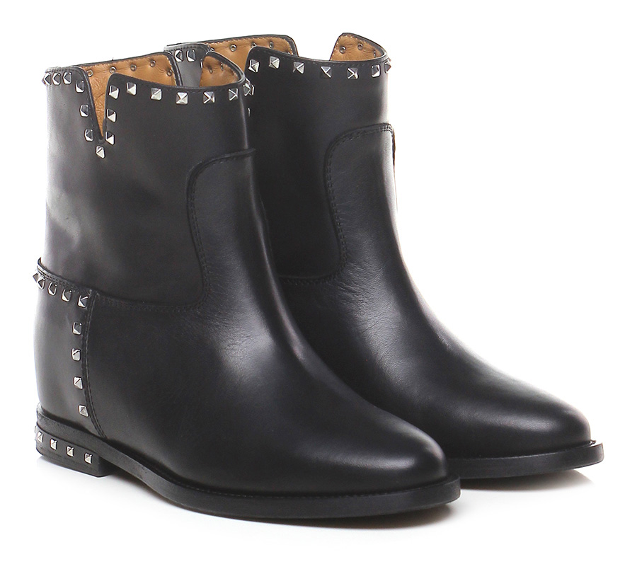 Tronchetto in pelle con borchie sul profilo, bordo tacco e tomaia, suola in cuoio. Tacco 20, zeppa interna 50.