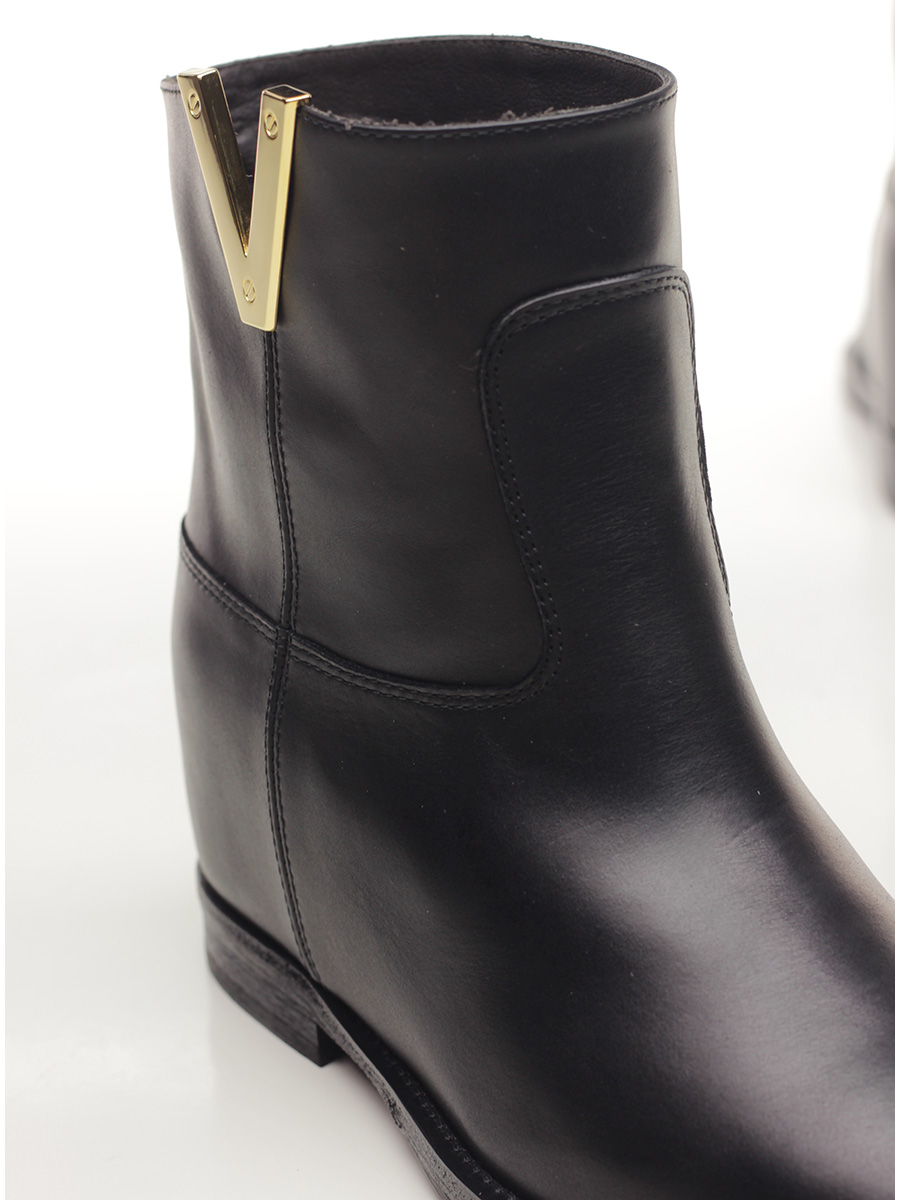 Tronchetto in pelle con accessorio laterale e suola in cuoio e gomma. Altezza tacco 20mm con zeppa interna 50mm.