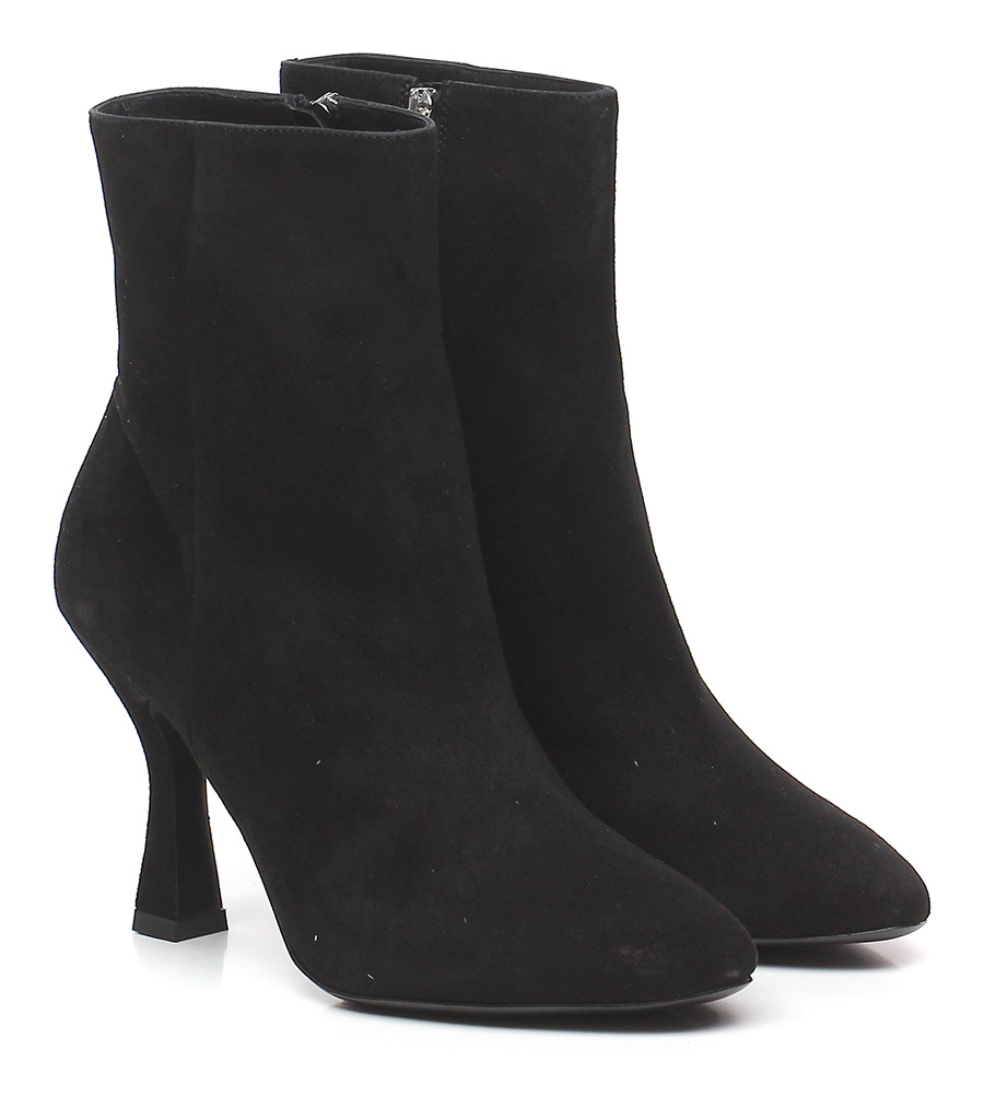 Tronchetto in camoscio con zip lato interno, suola in cuoio e gomma. Tacco 100.