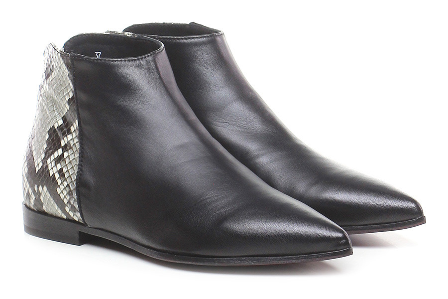 Tronchetto in pelle e pelle stampa pitone con zip sul retro, suola in cuoio e gomma. Tacco 20.