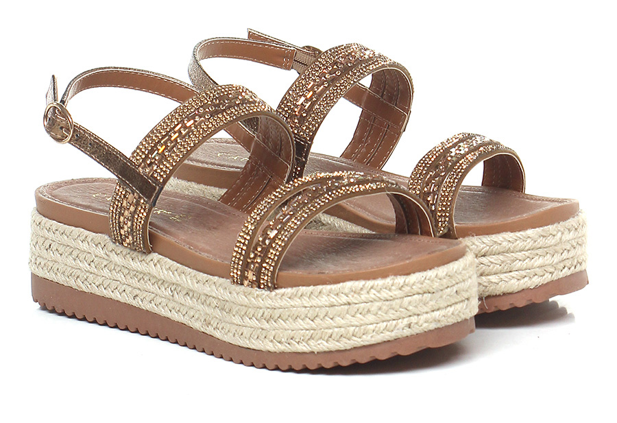 Zeppa in eco pelle laminata con multi strass su tomaia e cinturino su retro. Suola in gomma, tacco 55, platform 45 con battuta 10. Zeppa foderata in corda.