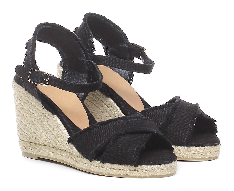 Zeppa in tessuto con cinturino alla caviglia, suola in gomma. Tacco 100, platform 20 con battuta 80. Zeppa e plantare rivestiti in corda.