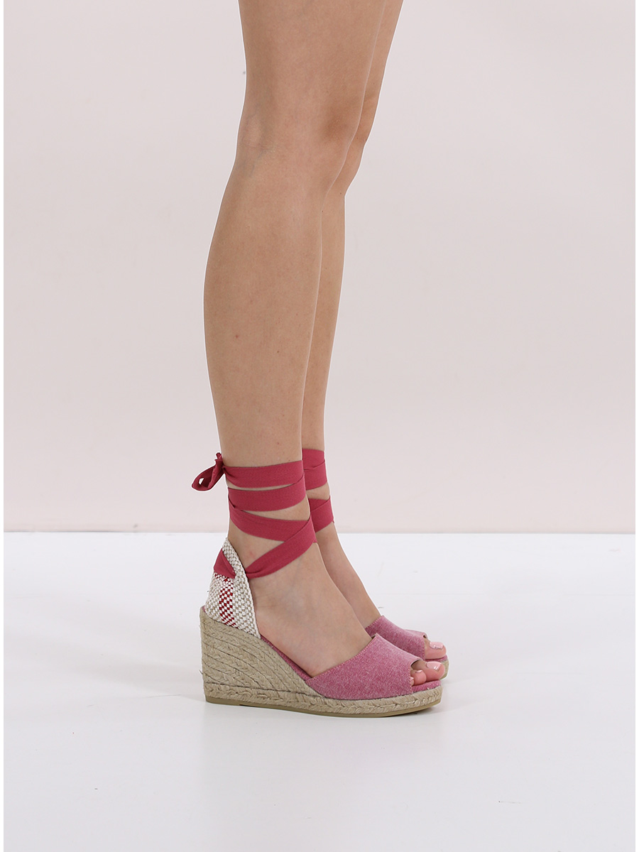 Zeppa in tessuto con laccio alla caviglia e suola in gomma. Altezza tacco 95mm, platform 25mm con battuta 70mm. Zeppa foderata in corda.