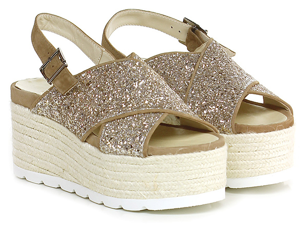 Zeppa in camoscio e glitter con cinturino su retro e suola in gomma. Tacco 80, platform 60 con battuta 20. Zeppa foderata in corda.