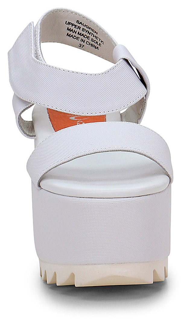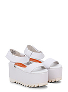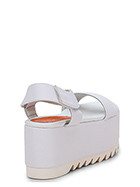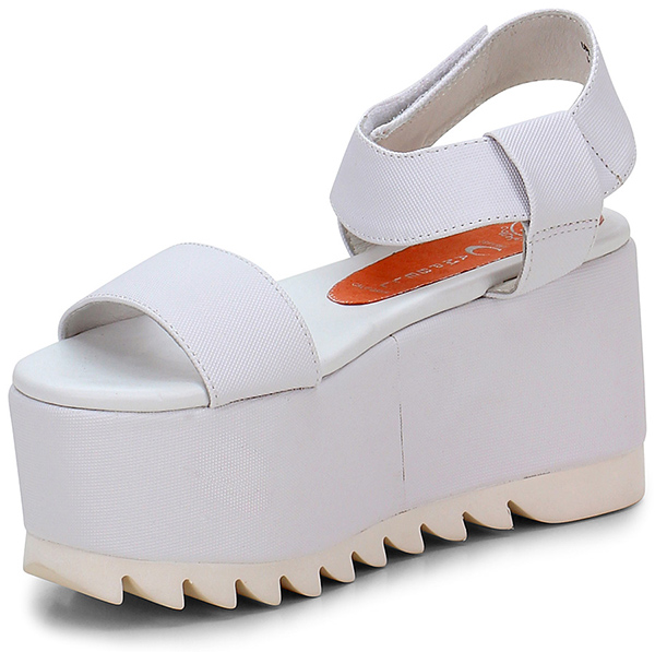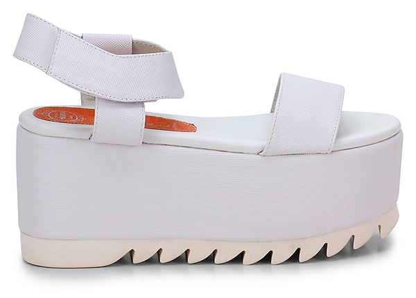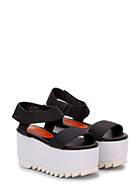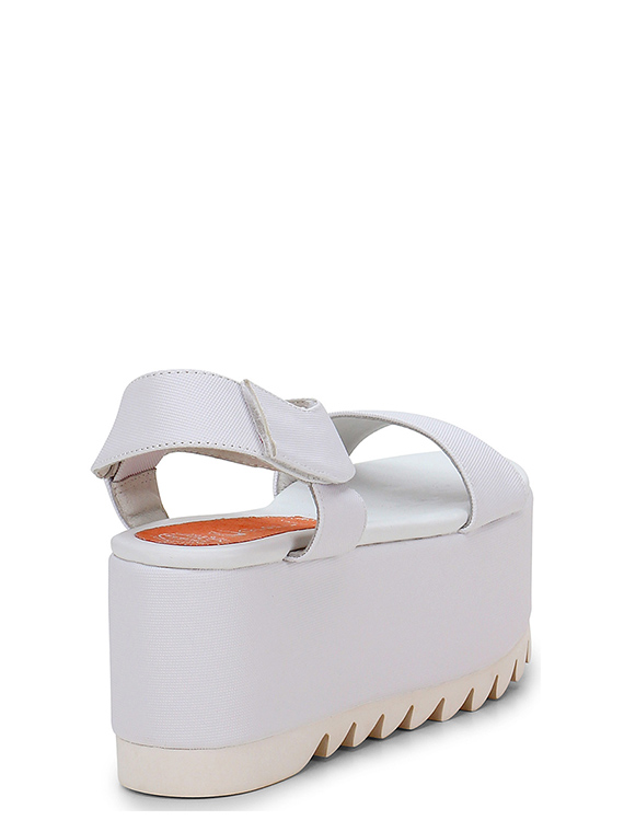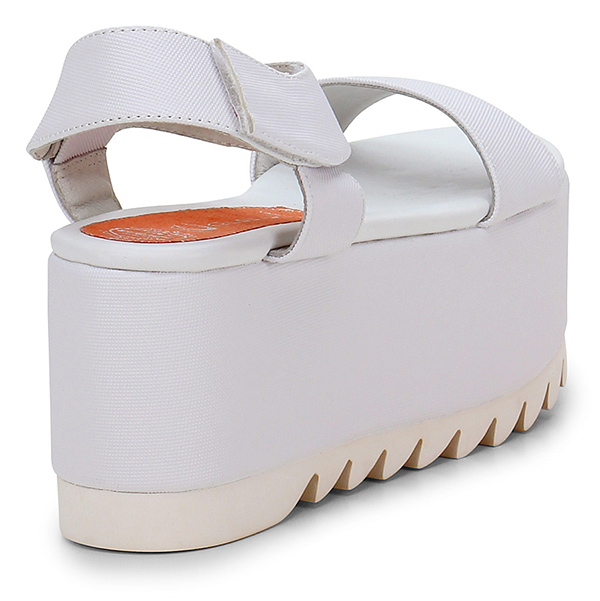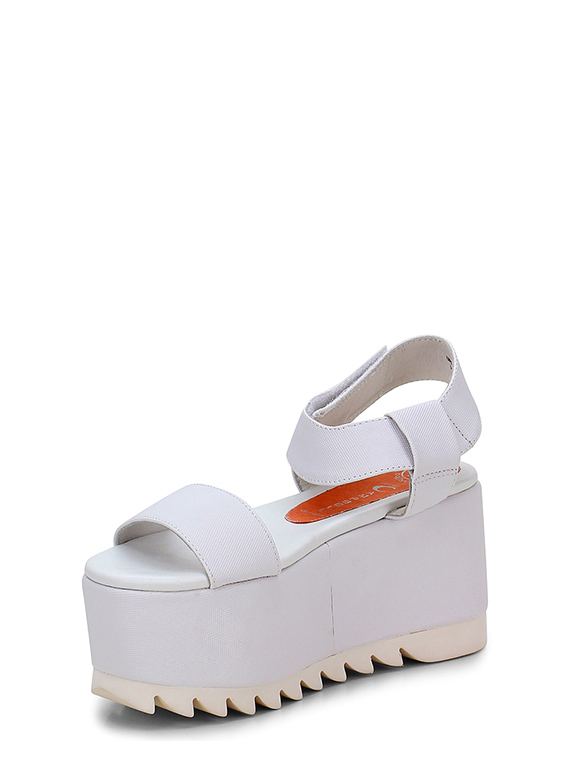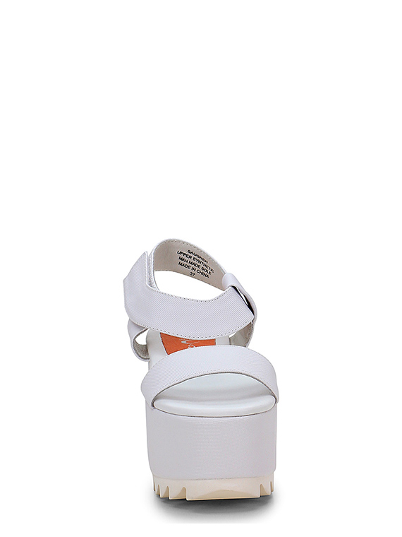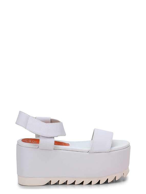 Zeppa in tessuto con cinturino a strap alla caviglia e suola in gomma. Tacco 90, platform 80 con battuta 10. Platò foderato in tessuto.