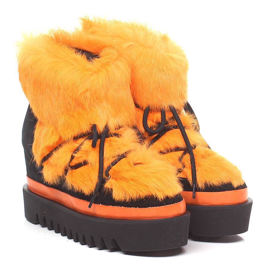Zeppa in camoscio e fake fur con tomaia reversibile alla caviglia. Suola in gomma, tacco 100, platform 35 con battuta 65.