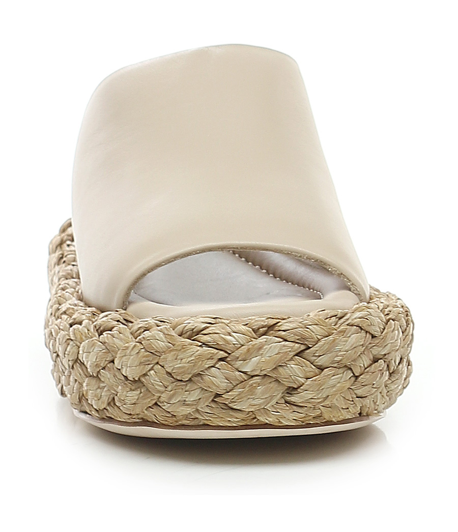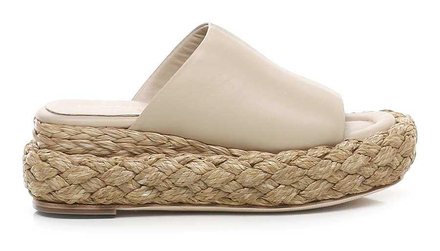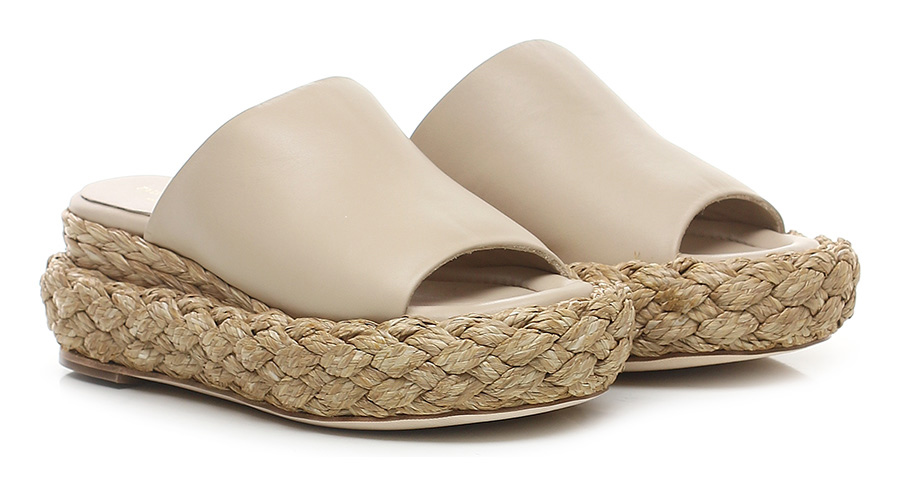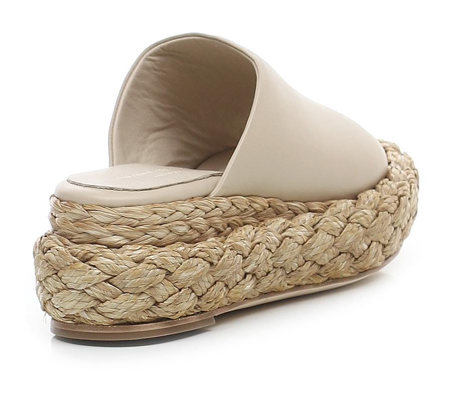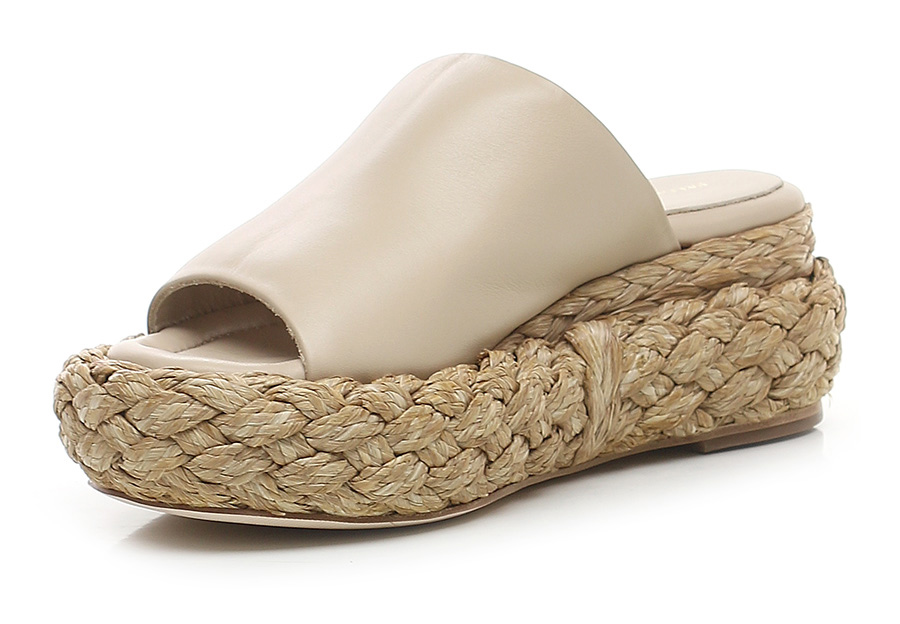 Zeppa in pelle con suola in cuoio. Zeppa e platform foderate in raffia intrecciata. Altezza tacco 60 mm, platfom 35 mm con battuta 25 mm.