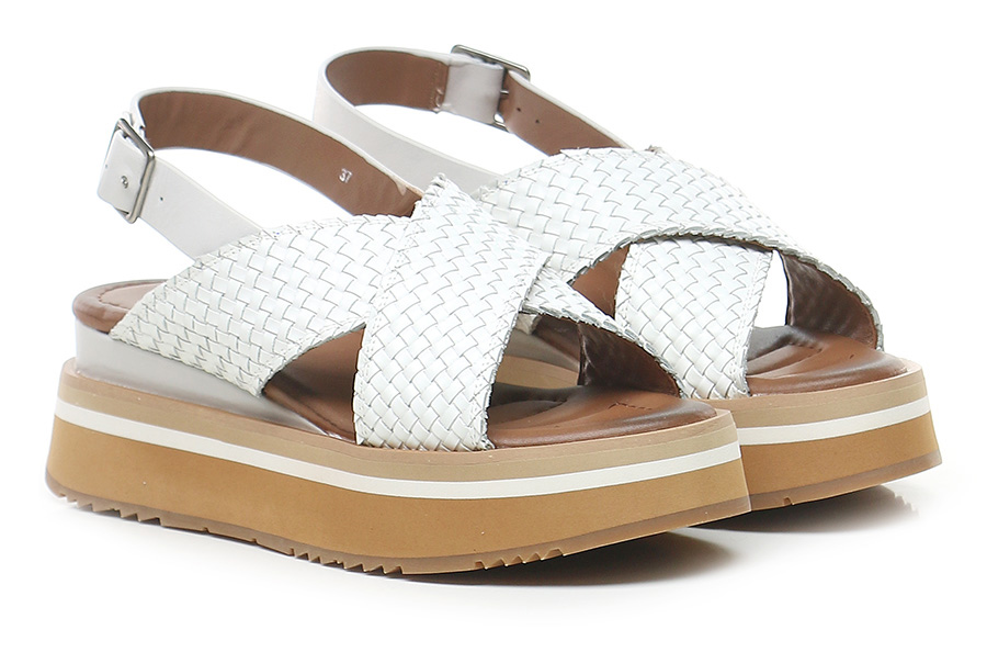 Zeppa in pelle intrecciata e pelle con cinturino sul retro e suola in gomma. Altezza tacco 60mm, platform 45mm con battuta 15mm.