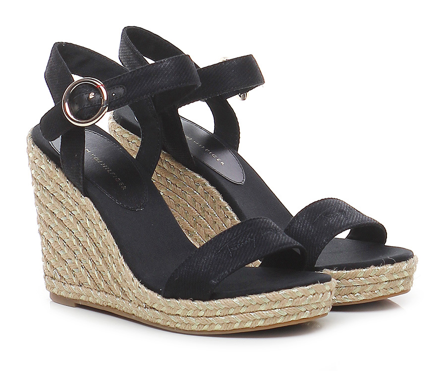 Zeppa in tessuto con cinturino alla caviglia, suola in gomma. Tacco 105, platform 25 con battuta 80.