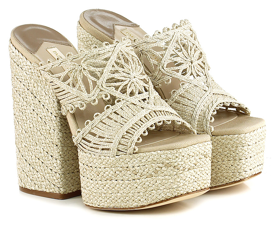 Sandalo alto in corda lavorata con suola in cuoio, tacco 155, platform 55 con battuta 100.