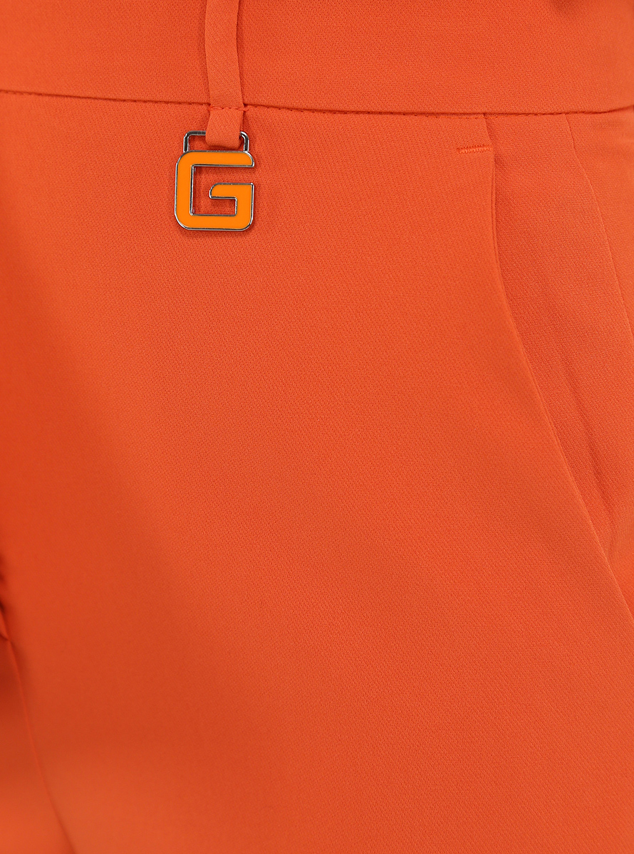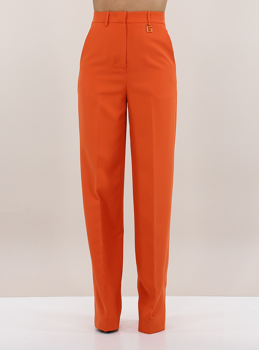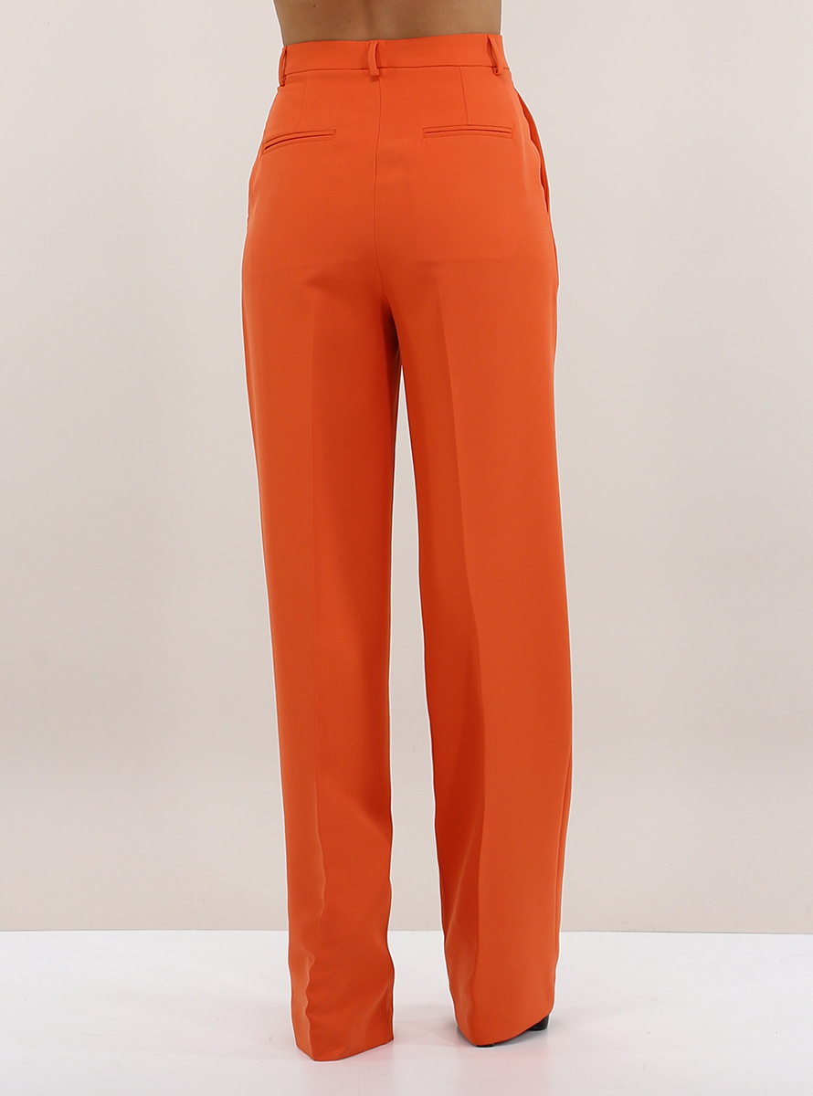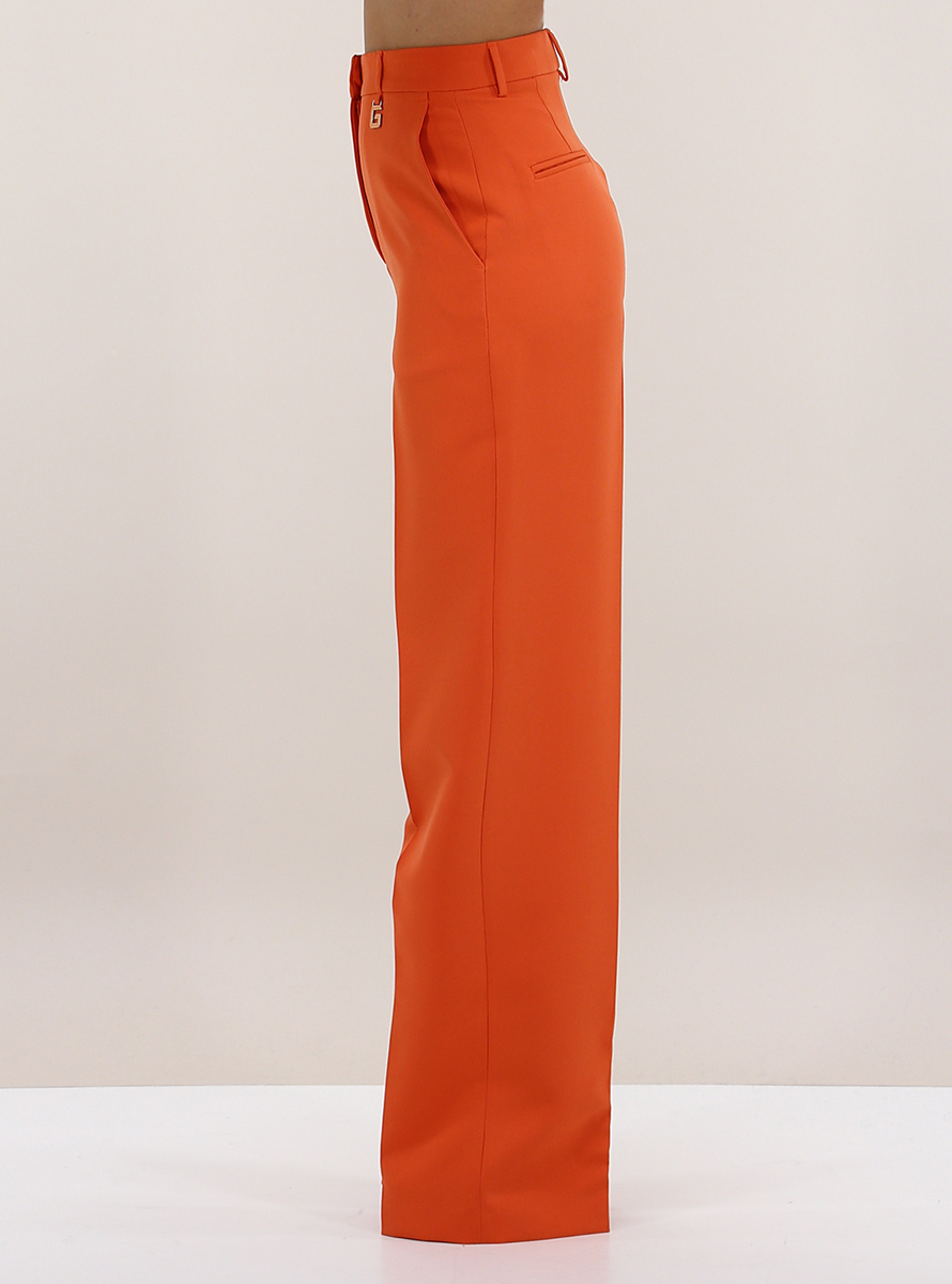 Pantalone a palazzo Gaelle Paris in cady. Vita alta con tasche all'americana e a filetti sul retro. La modella è alta 1,68 ed indossa la taglia 38.