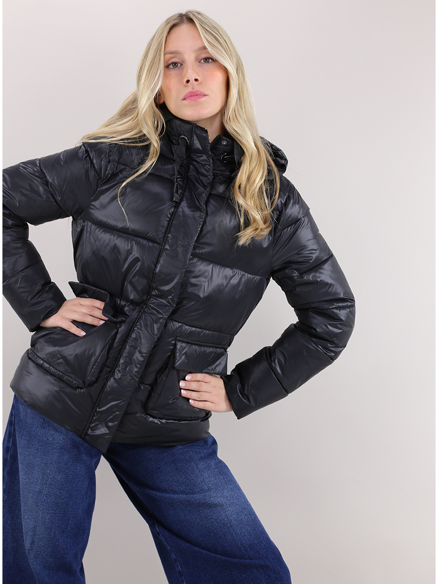 Piumino Kocca a maniche lunghe e collo a fascietta. Cappuccio con coulisse con inserti in velluto e lurex. Tasche a toppa frontali e chiusura a zip con automatici. Coulisse sul retro. La modella è alta 1,70 cm ed indossa la taglia XS.