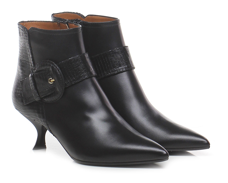Trochetto in nappa con inserti in pelle stampa teyus, zip lato interno e cinturino con fibbia laterale, suola in cuoio e gomma. Tacco 55, svasato.
