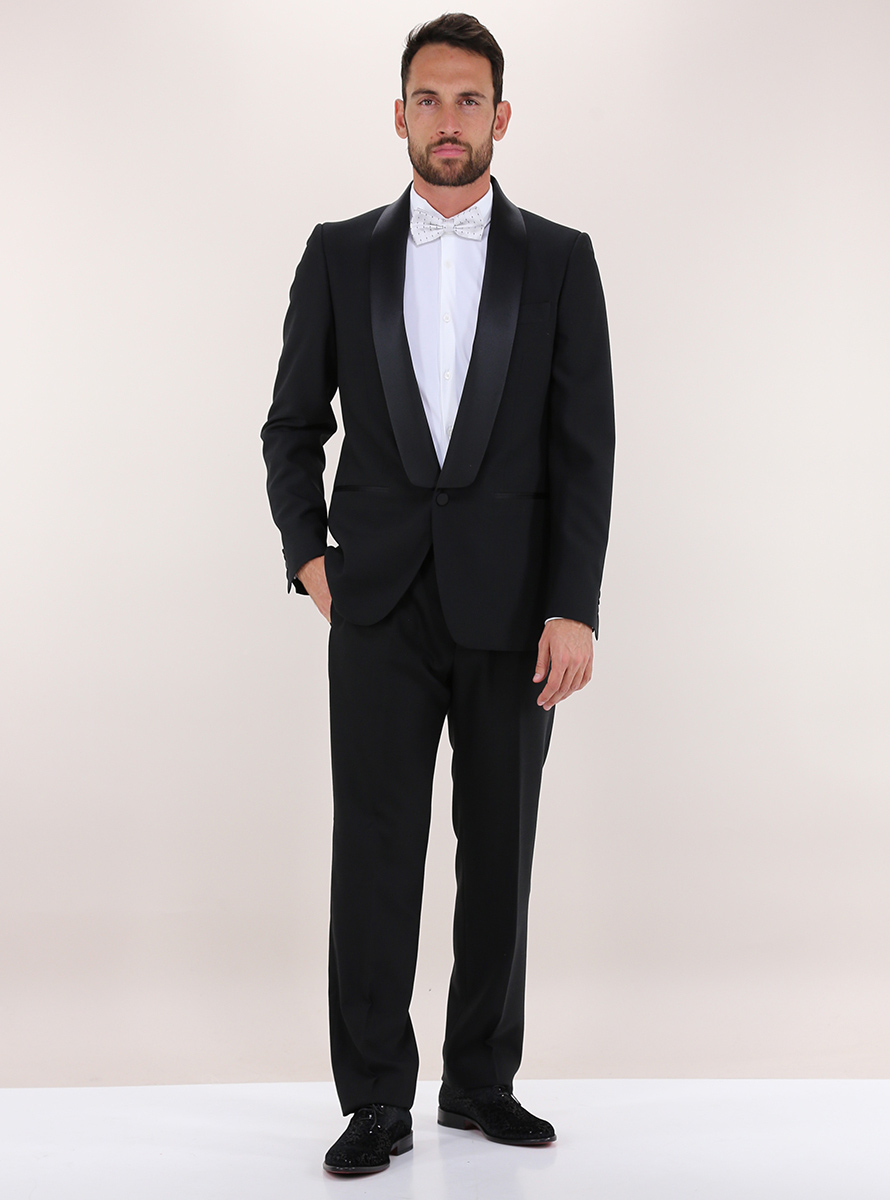 Smoking sartoriale Grifoni in fresco lana stretch. Giacca a maniche lunghe e rever sciallato in raso. Chiusura a un bottone e tasche a filo frontali. Mono spacco sul retro. Pantalone con tasche a filo laterali e sul retro. Il modello è alto 1.80 ed indossa la taglia 48.