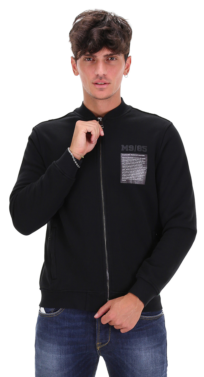 Felpa in cotone garzato con zip e stampa applicata. Il modello è alto 1,82 e indossa la taglia M.