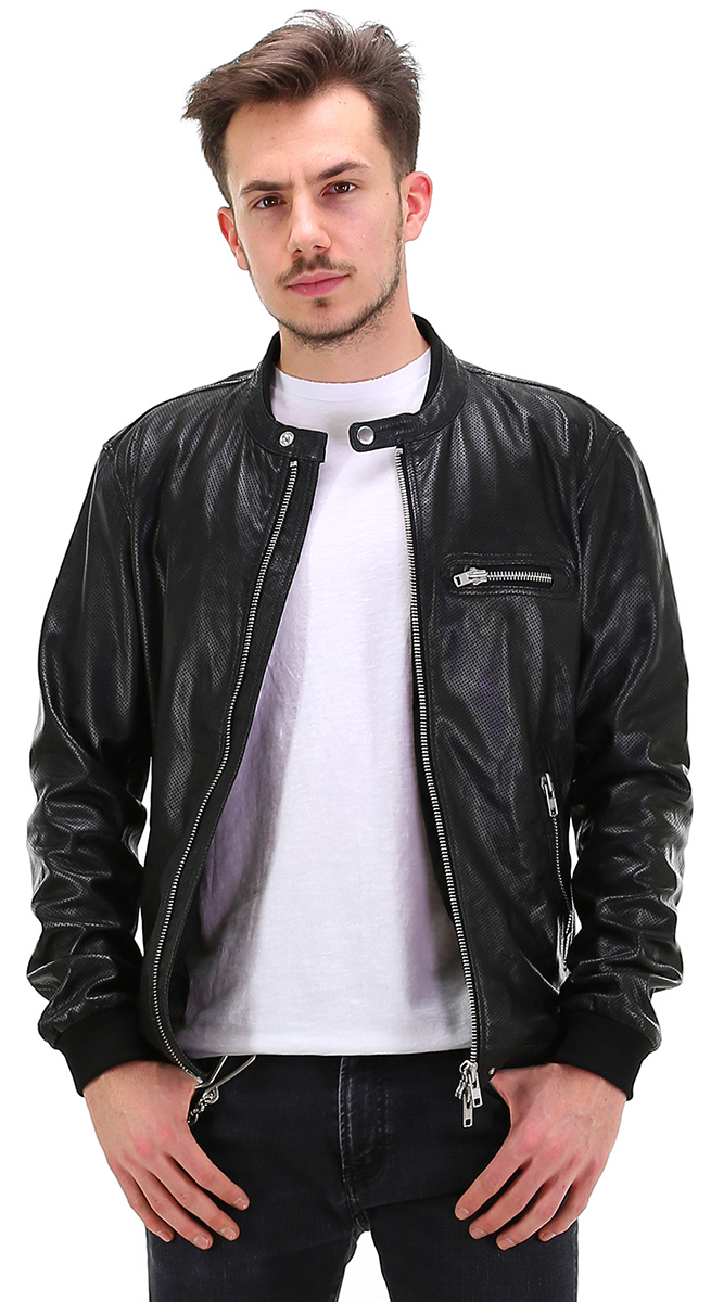Giubbotto uomo modello Biker in vera pelle ad effetto traforato , collo a coreana, chiusura zip frontale foderato internamente con tasche. Il modello è alto 1,78 ed indossa la taglia 52.