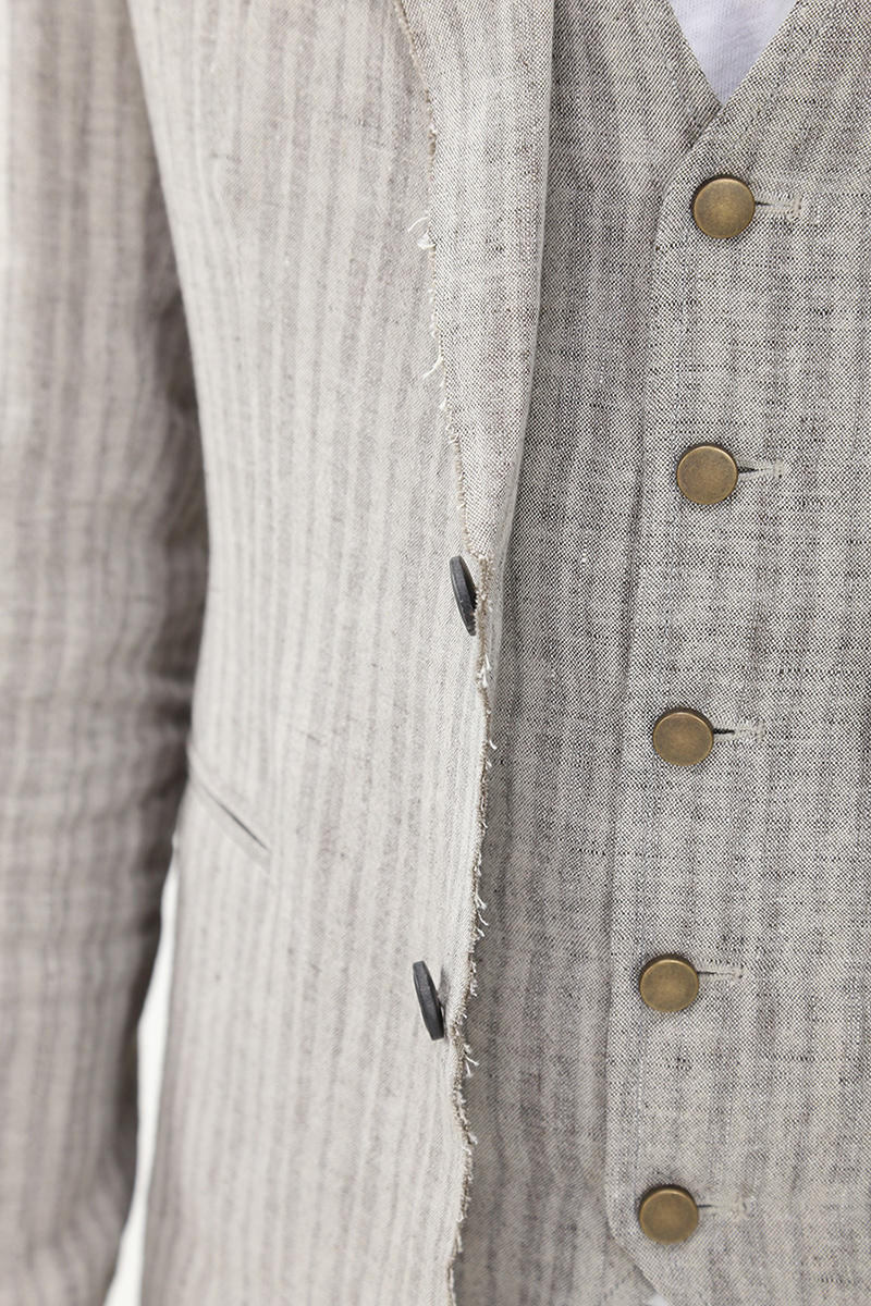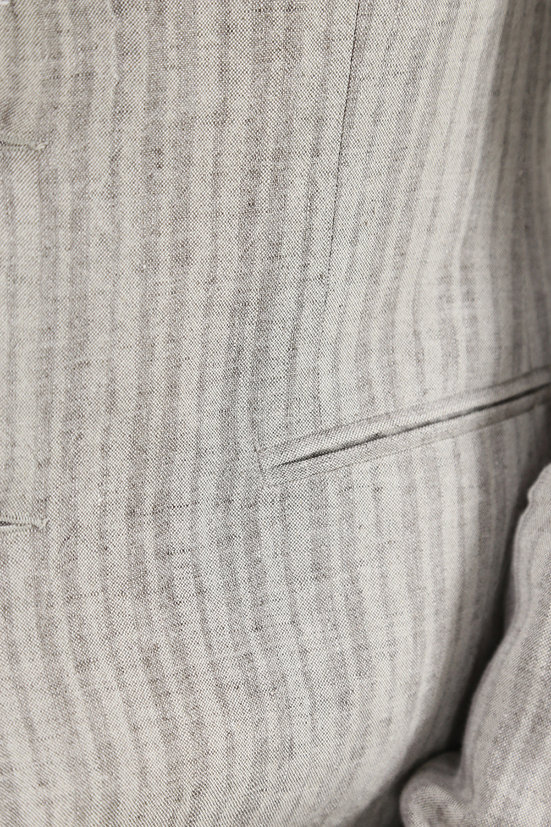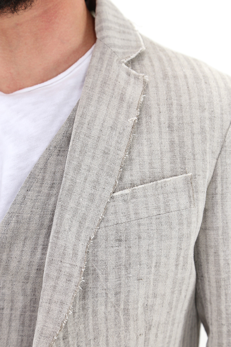 Giacca Messagerie in lino e cotone a maniche lunghe con tasche a filetto. Bordi a taglio vivo. Il modello è alto 1,80 cm ed indossa la taglia 50.