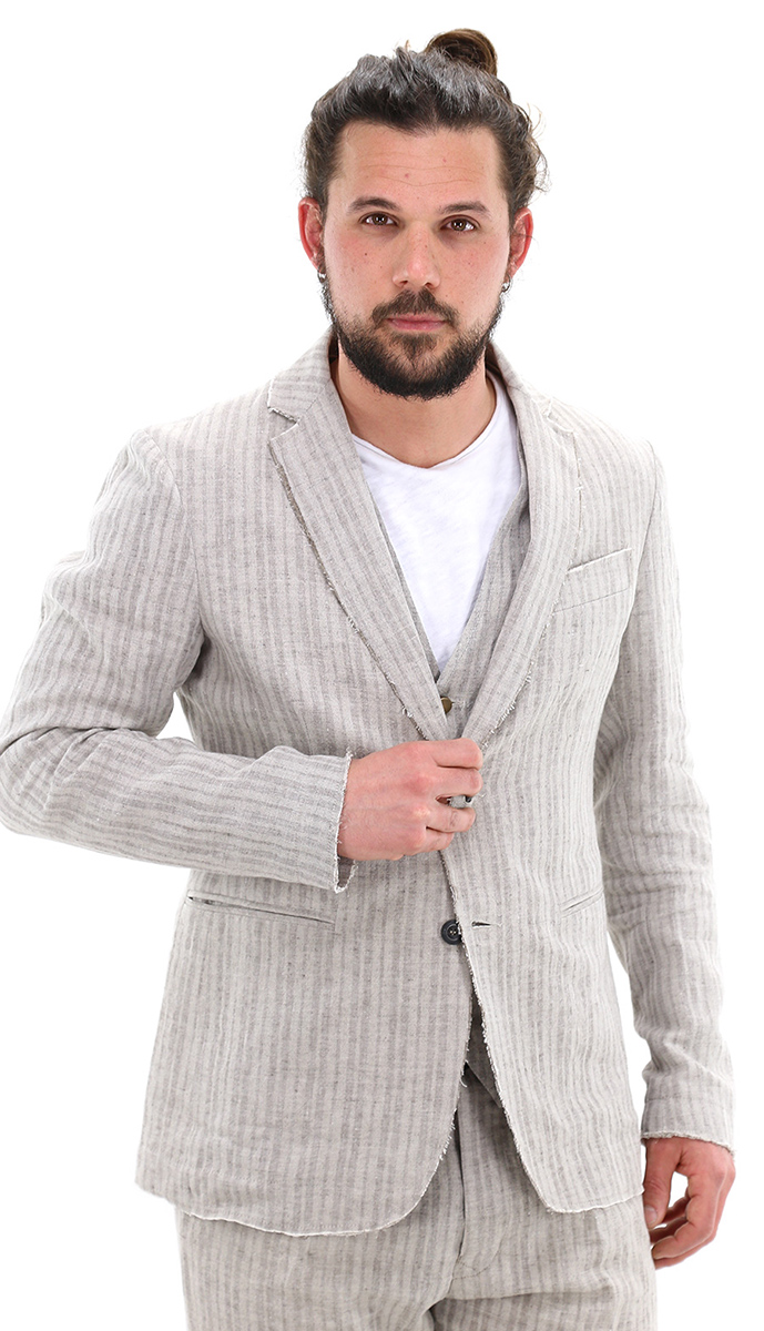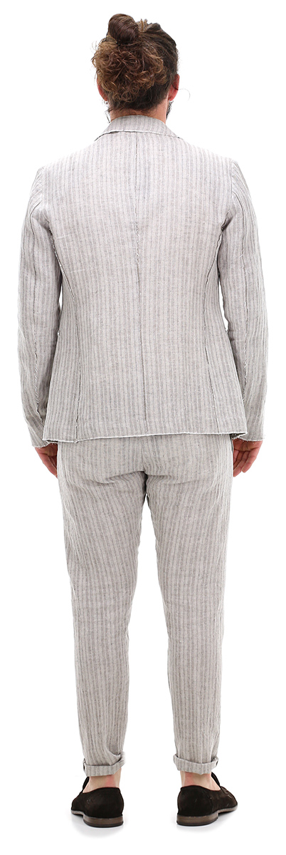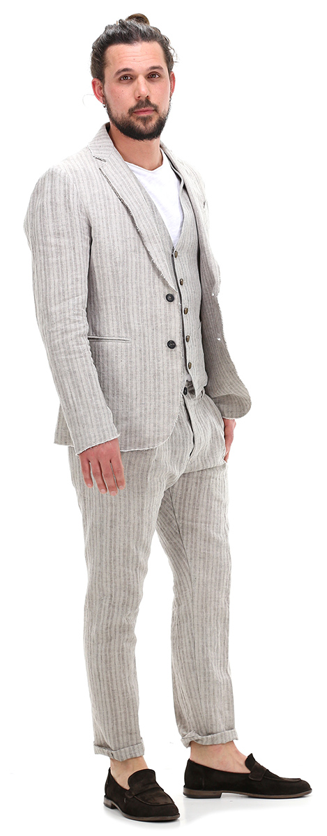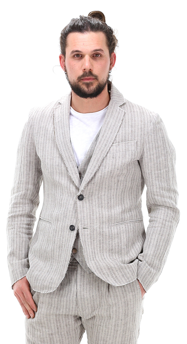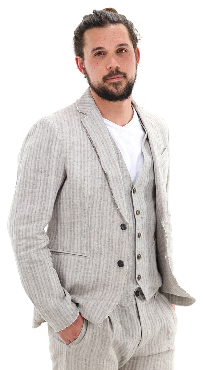 Giacca Messagerie in lino e cotone a maniche lunghe con tasche a filetto. Bordi a taglio vivo. Il modello è alto 1,80 cm ed indossa la taglia 50.