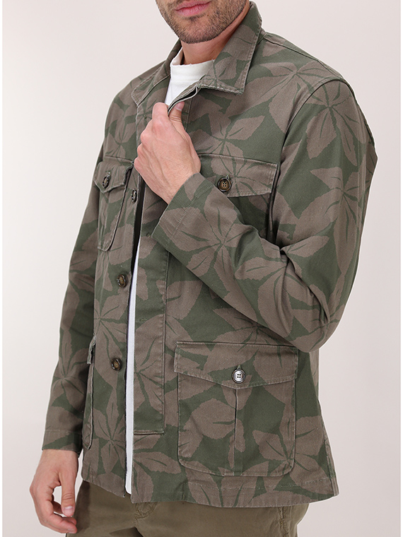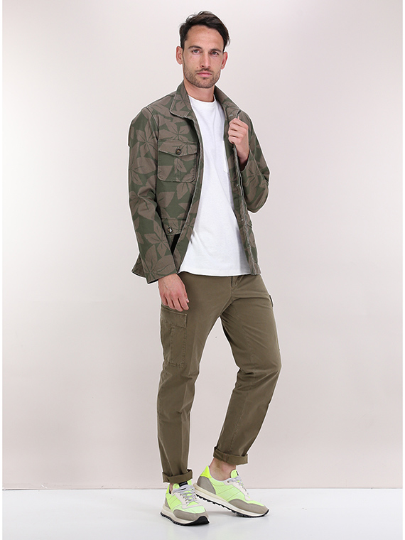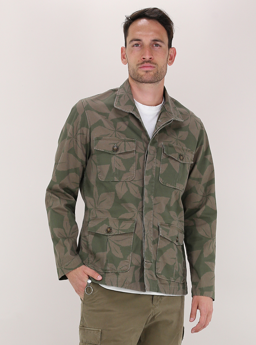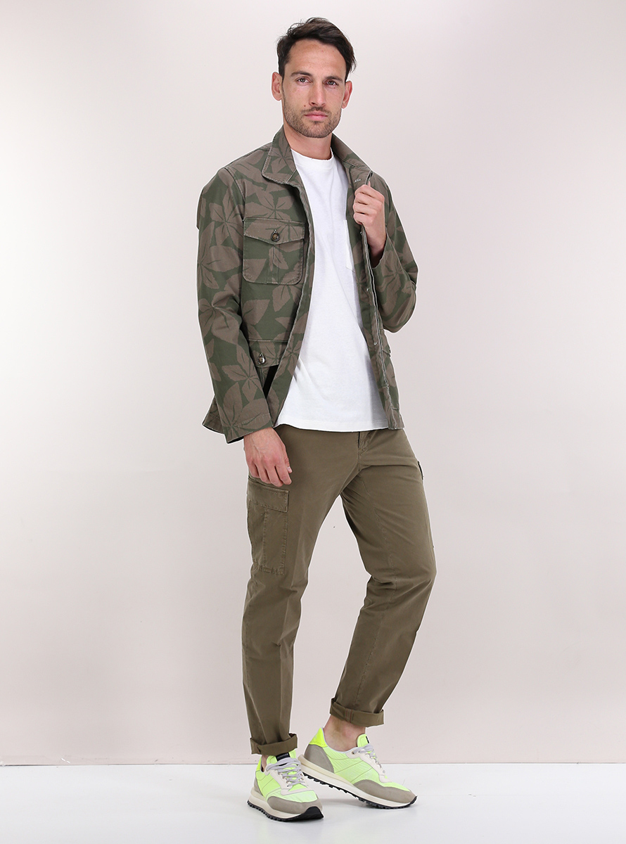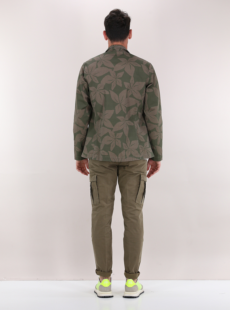 Giacca militare Ognunolasua in cotone stretch. Maniche lunghe e collo classico. Tasche a toppa frontali. Fantasia bicolor. Il modello è alto 1,80 ed indossa la taglia M.