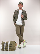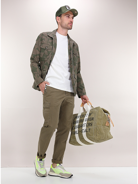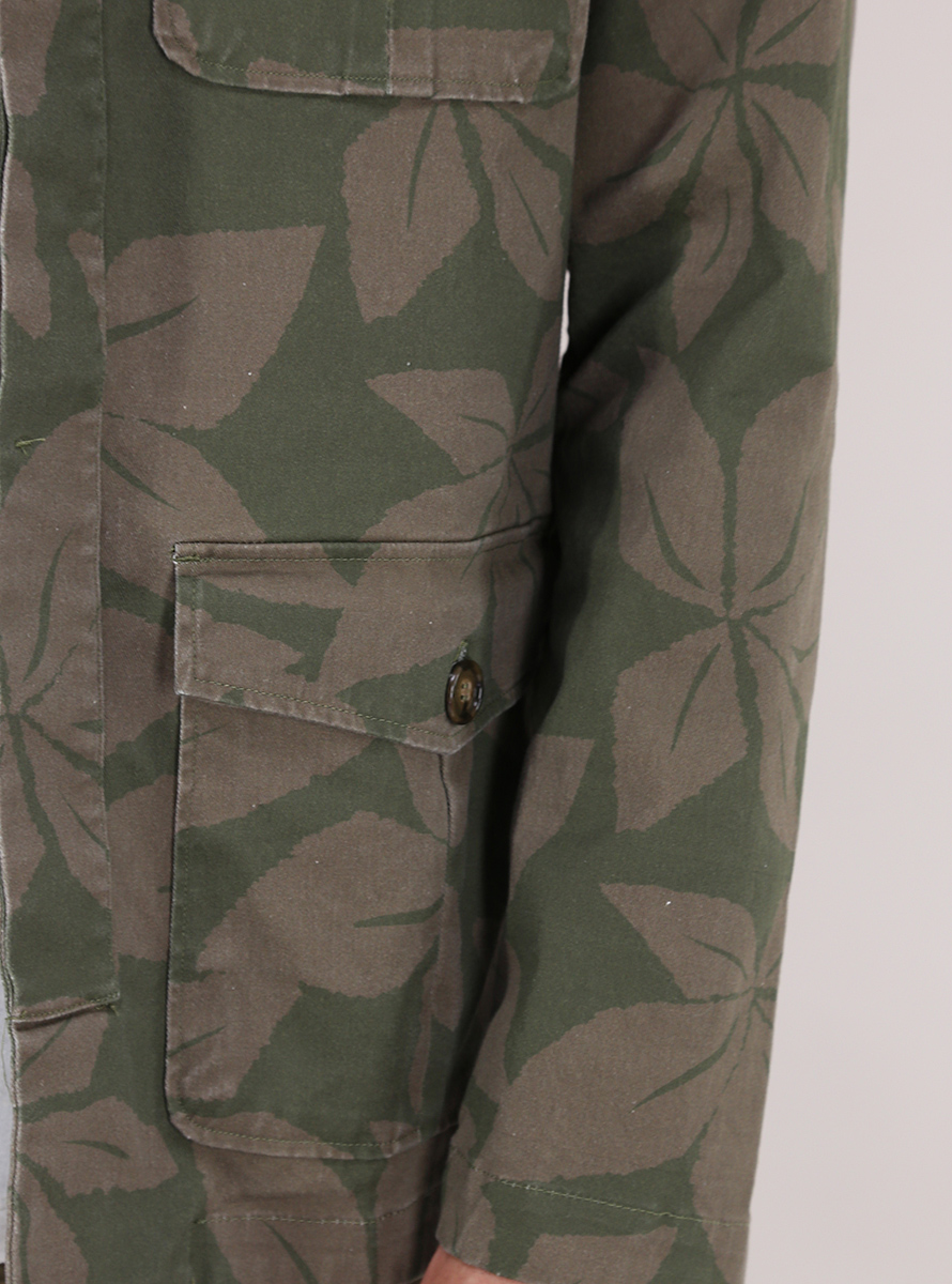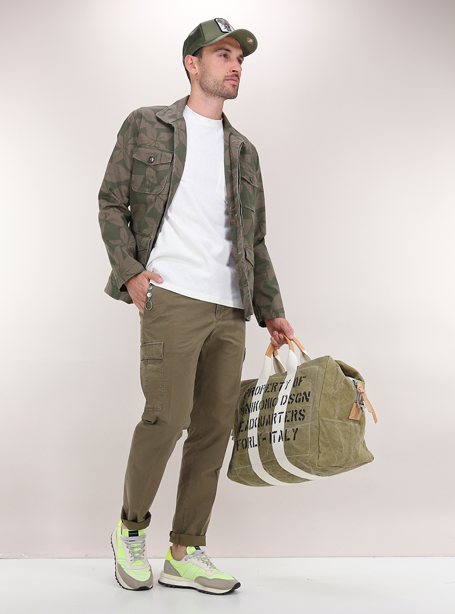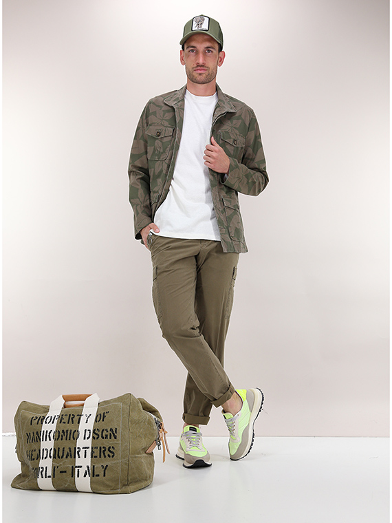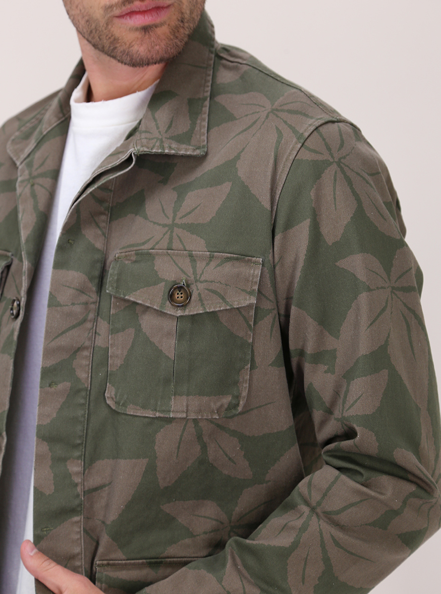 Giacca militare Ognunolasua in cotone stretch. Maniche lunghe e collo classico. Tasche a toppa frontali. Fantasia bicolor. Il modello è alto 1,80 ed indossa la taglia M.
