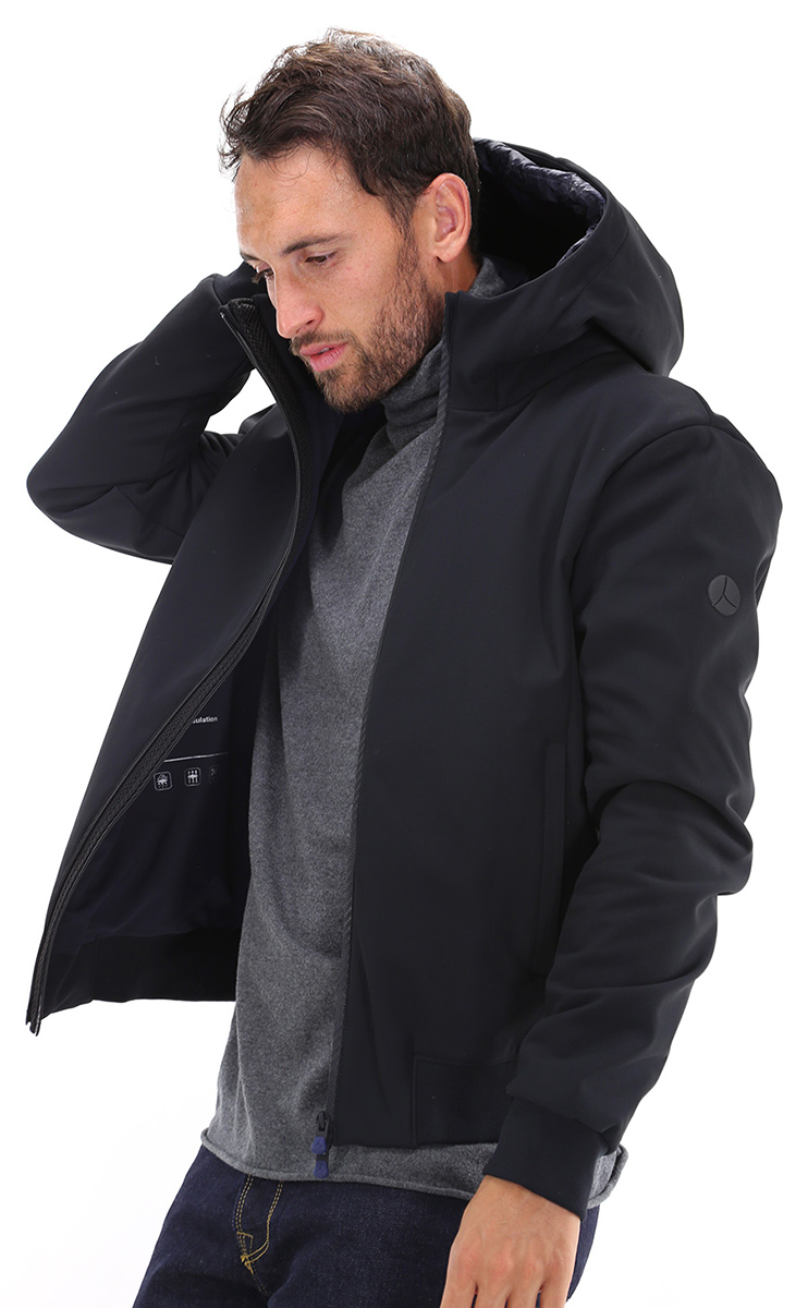 Giacca in tessuto soft shell water repellent. Maniche lunghe con polsino e collo a cappuccio imbottito staccabile. Tasche a filetto e doppia zip di chiusura impermeabile e traspirante. Il modello è alto 1,81 cm ed indossa la taglia 50.