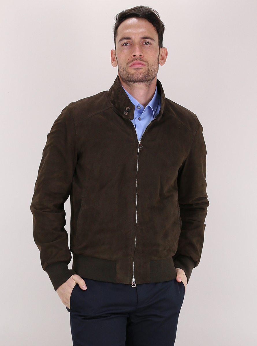 Giacca in camoscio foderata in cotone Stewart a maniche lunghe e collo a fascetta con bottoni. Chiusura a zip frontale a doppio cursore e tasche a filo laterali. Bordi e fondo a polsino. Il modello è alto 1.80 ed indossa la taglia M.