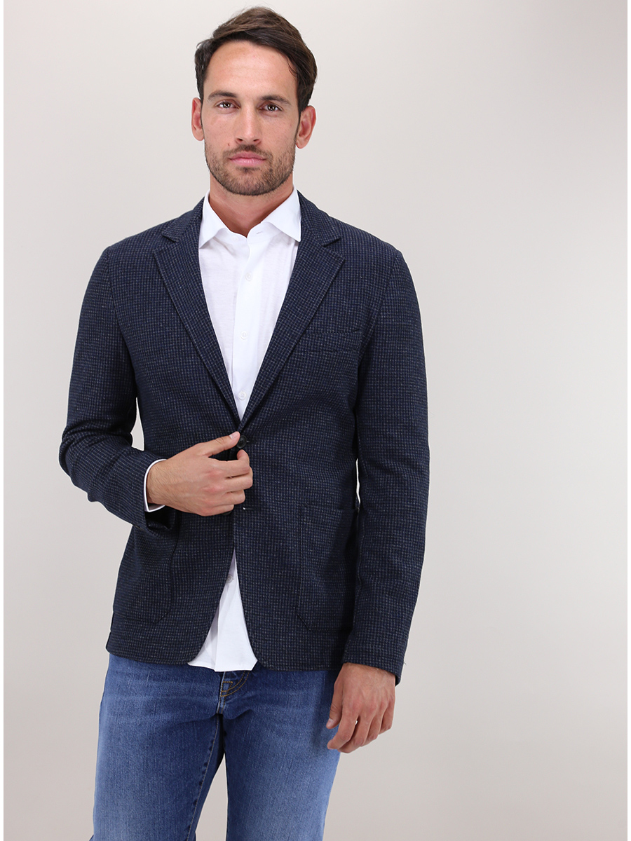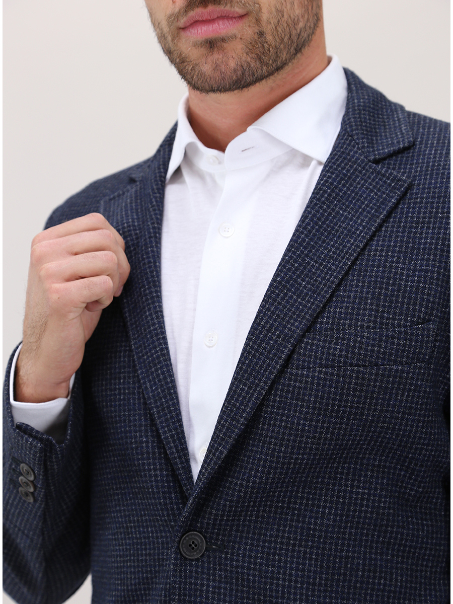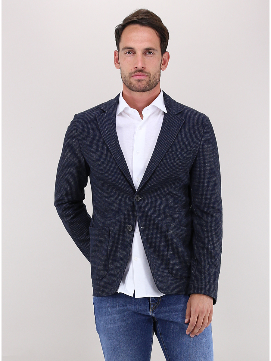 Giacca sfoderata T Jacket in cotone e lana. Maniche lunghe e collo a reverse. Tasche a toppa frontali e spacco sul retro. Chiusura a due bottoni. Micro fantasia a quadri. Il modello è alto 1,80 cm ed indossa la taglia M.