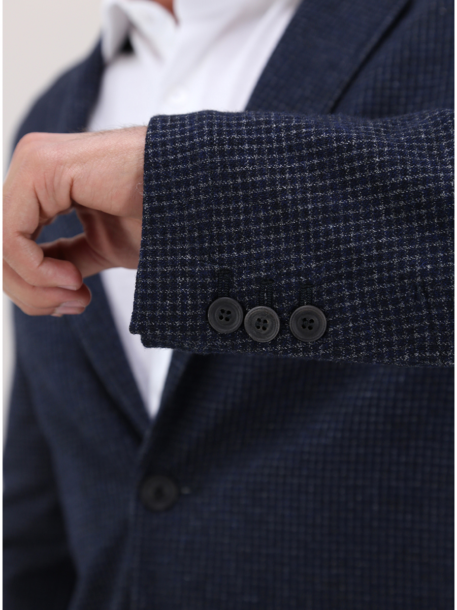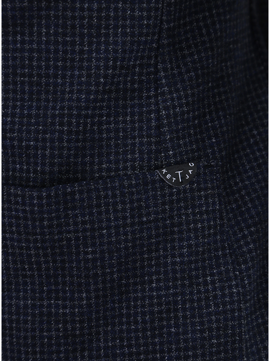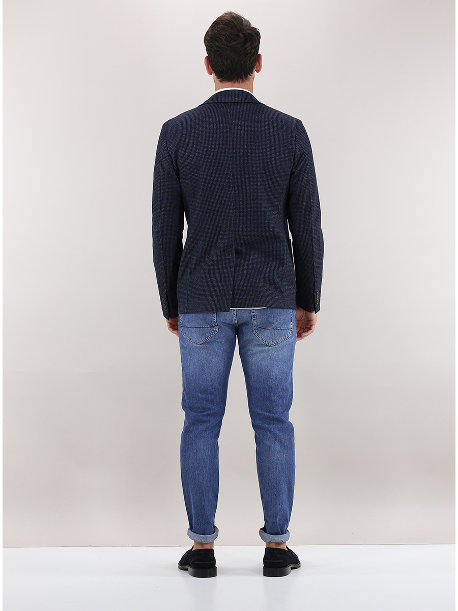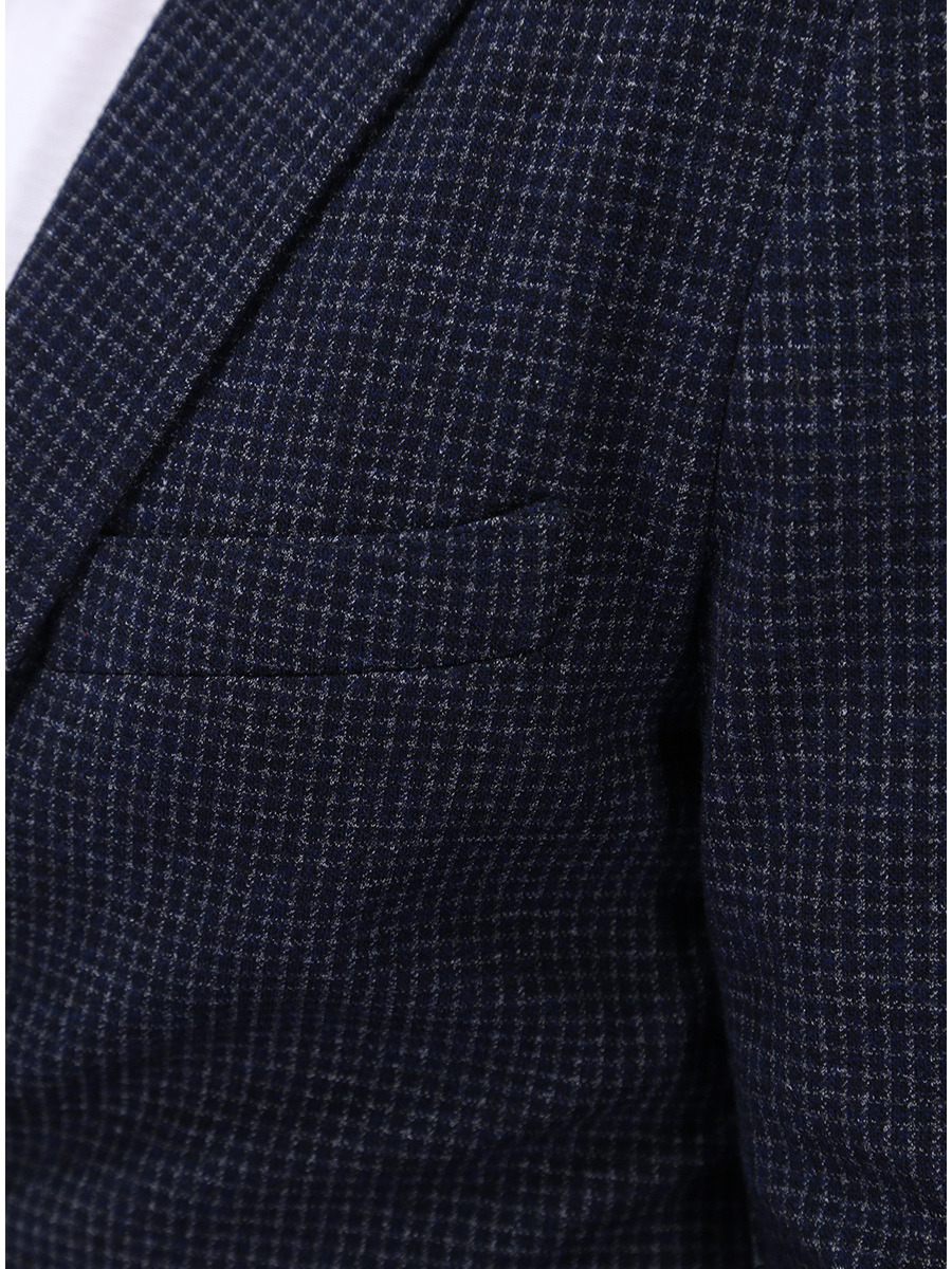 Giacca sfoderata T Jacket in cotone e lana. Maniche lunghe e collo a reverse. Tasche a toppa frontali e spacco sul retro. Chiusura a due bottoni. Micro fantasia a quadri. Il modello è alto 1,80 cm ed indossa la taglia M.